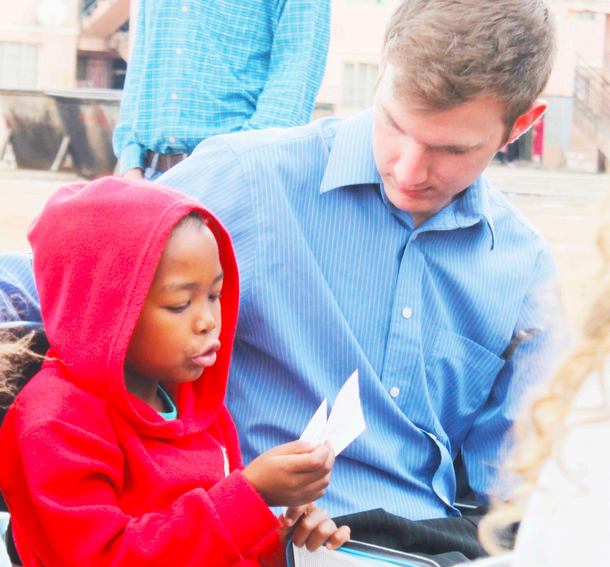 RIGHT: Before a church service, graduate student, Nathan Davis talks with Gabby about the Bible.