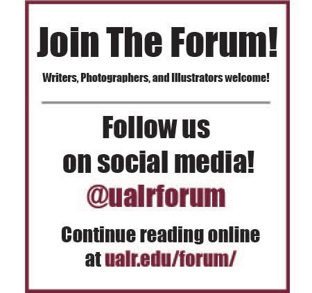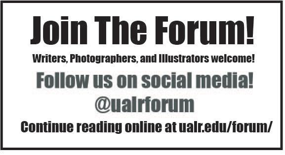 The Forum is the official student newspaper at the University of Arkansas at Little Rock. The Forum is funded in part by the student activity fee; members of the UALR community are allowed one copy per edition. The opinions expressed in The Forum are those of the staff and contributing writers and do not represent the official views of UALR. Advertising inquiries should be referred to The Forum’s advertising office and can be reached by calling 501-569-3319. The Forum is published 7 times in each of the fall and spring semesters. The Forum editor can be reached at 501-569-3265. All material published in this newspaper is copyrighted.