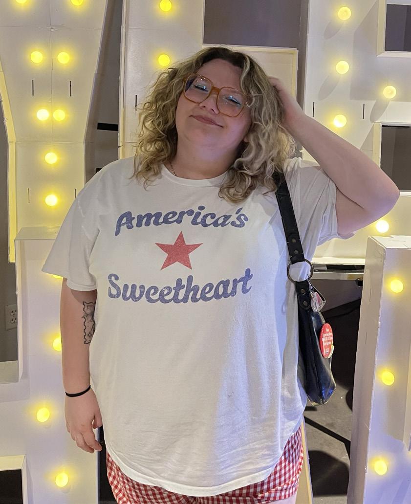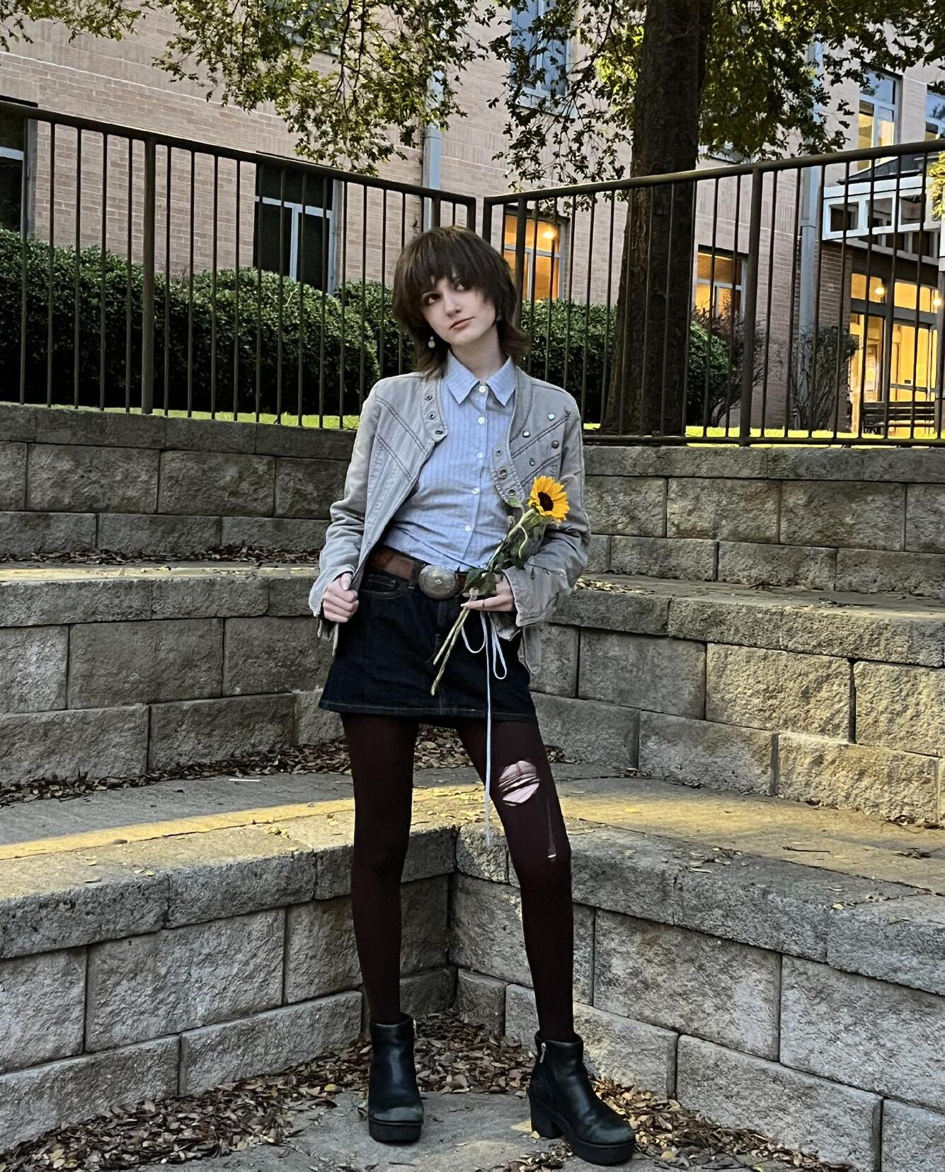 “My style has become more fun in college. I feel more free to experiment with looks and fun details like makeup. Surprisingly, walking to class has changed how I dress. I like to listen to music when I do, and that music has had an effect on which aesthetics I lean towards. At the start of my freshman year, my style was more breathy. Now, as I listen to artists like Bowie and MGMT, it’s become more moody. I’ve settled into what I like and dislike more as a person, and this is translated into how I dress,” said Eanes. “ I always try to add some fun little personal detail - right now that fun is translated through color for me. I can usually be found wearing some color of tights under my shorts. I like to add fun through my haircuts and jewelry, too. One thing that hasn’t changed is my love of a good boot and deep pockets.”