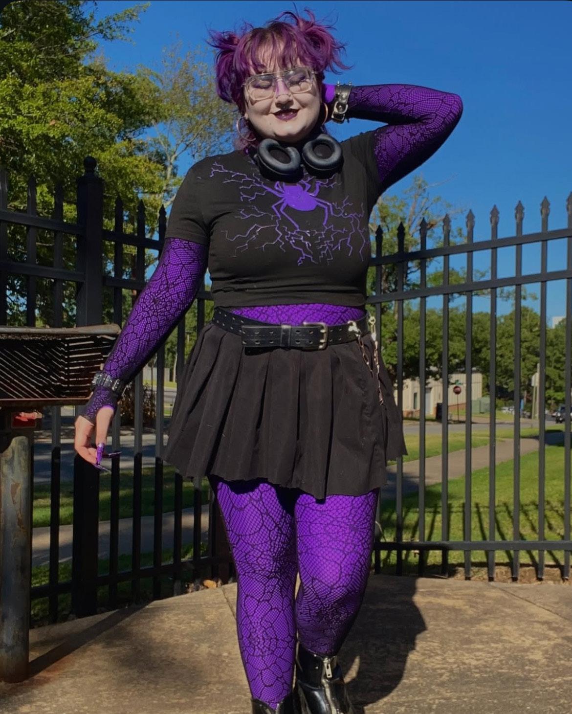 “The process of finding [my style] was finding media that I knew I wanted to look like. Raven from Teen Titans, Elvira, or any of the characters from Blade. As I got older, I started thrifting and going to the mall and buying things that reflected those characters from those movies. I started wearing them. Some things would feel like [me] and some things [don’t] feel like who I am. Mixing and matching various characters into one outfit,” said Goforth. “When I first came to college, I wore a lot of sweatpants, jeans, and a t-shirt. I had only been out publicly as non-binary for a little bit. I was very into my transmasculine era. I dressed like a boy for a very long time. I liked it, I loved dressing like a boy. I realized that boy clothes get so boring, so I started branching out. I hated dresses growing up, and I hated