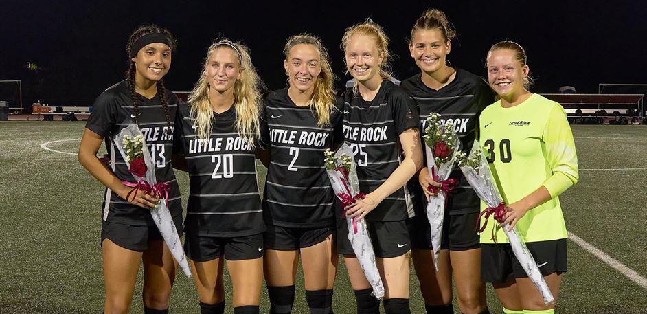 Senior Night for the UA-Little Rock women’s soccer team was held on Sept. 17, 2021 at 8:30pm. It was originally scheduled for 7pm but was delayed due to lightning. They played against Troy at UA-Little Rock’s very own Coleman Sports and Recreation Complex stadium. UA- Little Rock took the win in overtime ending the game 1:0. The six seniors were Hilma Svalander, Fanney Einarsdottir, Astros Luckas, Abril Lucio, Bergros Asgeirsdottir, and Natalee Geren. They were called to the middle of the field where they each received roses and were recognized for their years of hard work, commitment, and success. It is inspiring to see these girls’ strength and determination on the field after years of practicing. Their teamwork and hardship to be the best is what makes the UA-Little Rock soccer team stand out.