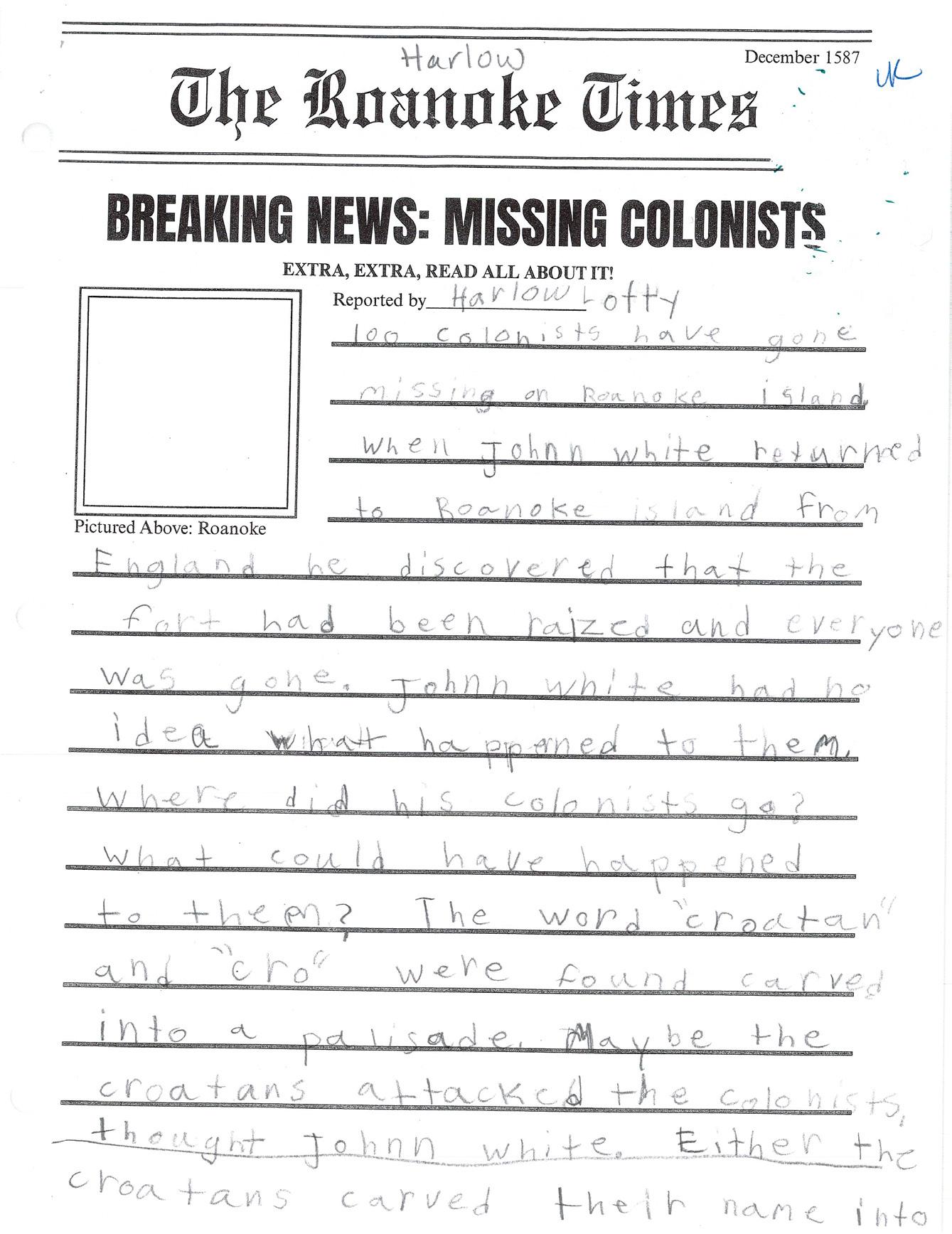 The next day we had a picnic because it was warm outside We found a perfect spot for our breakfast So we laid out the blanket and started eating After a little while Alysa found a sign that said “croatans ” What are “croatans?” I asked my dad “I’m not sure” he replied