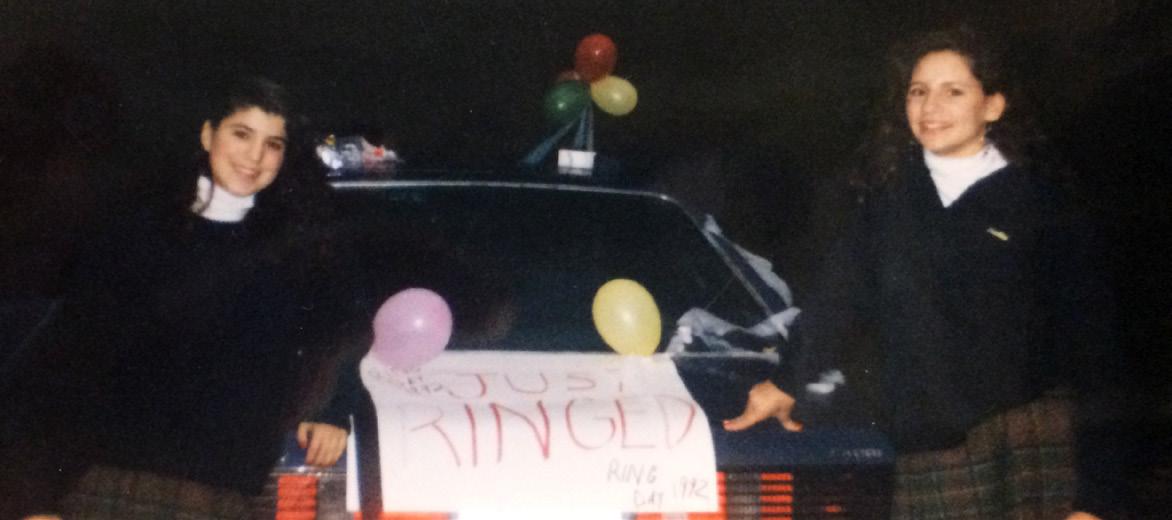 Mrs. Clarizio: So, Ring Day. The first Ring Day I don’t remember. The second Ring Day I was a sophomore and I remember that the sophomores sang to the seniors, and I remember that we had to be in homeroom. We had homeroom before the school day had started and had to practice it. The song we sang as sophomores was “In My Life” by The Beatles. And I remember sitting in the Hall and practicing it. Junior Year was my favorite because I don’t really remember my Ring Day, except through a picture or two, but I do remember being a Junior. I remember our theme was “Safari” and it was to die for, and the entire lawn and campus was full of life size animals created by the Art Department. I remember staying super late at night and working so hard and loving it so much. Then, senior year was different because Ring Day used to be on a Friday or a Thursday, and it was either the night before or the night after, and we had a dance. It was with all of our friends at I think the Larchmont Club or the Athletic Club, and that was so much fun. I don’t remember much more, but I do remember my Ring Day date: It was October 15. I also remember being very excited to wear the green sweater, and we were allowed to wear sunglasses. It was very different, and it definitely wasn’t as crazy as it is now.