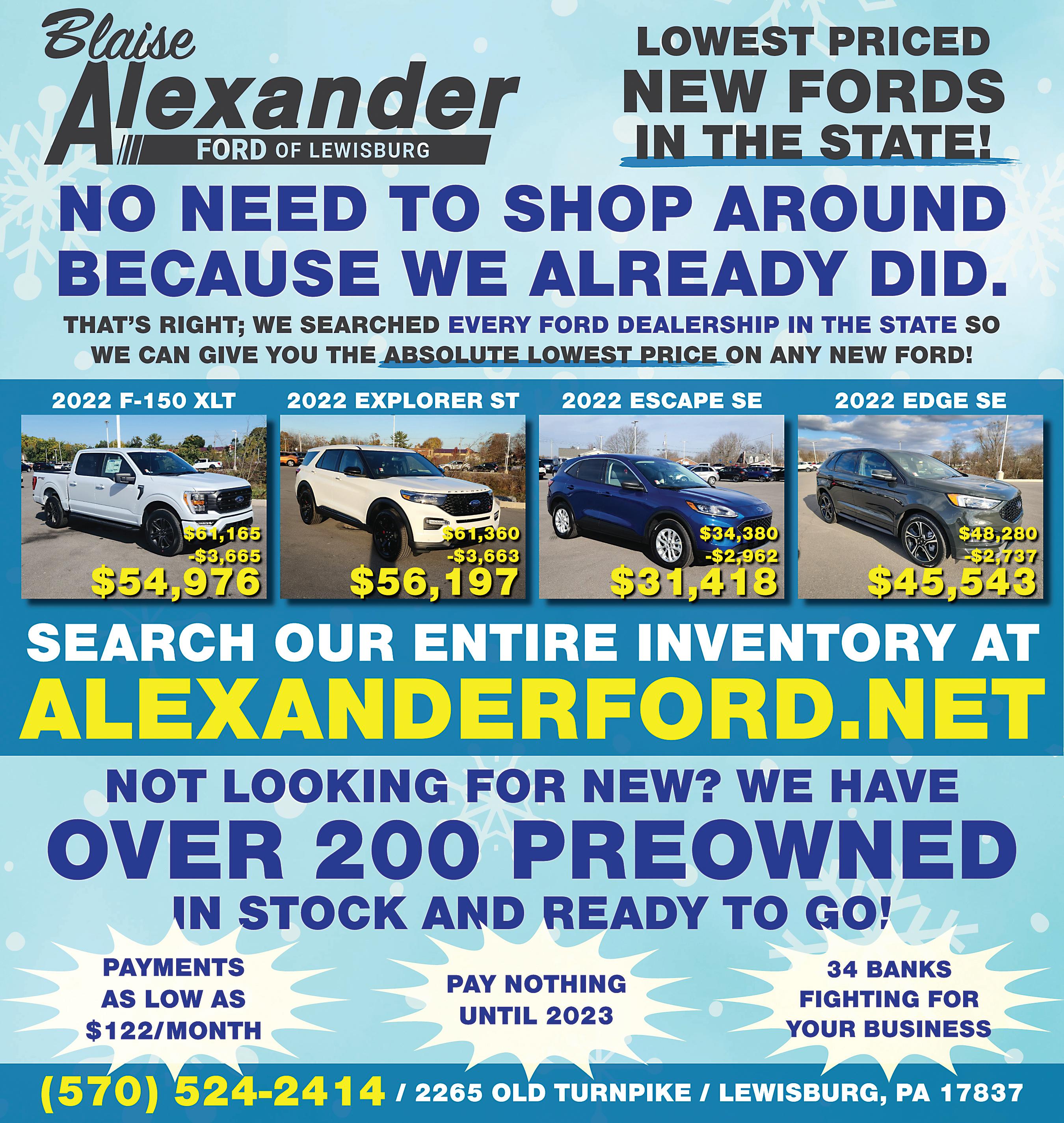 YOUR HOMETOWN COMMUNITY PUBLICATION OF THE SUSQUEHANNA VALLEY • THE VALLEY TRADER Weekly • December 12th, 2022 - December 18th, 2022 • PLACE A CLASSIFIED AD — CALL TODAY 570-444-9850 3 HELP WANTED DELIVERY One Day A Week Every Other Week Montour/Columbia Co Area Contact The Valley Trader at (570) 444-9850 Must be dependable and have dependable vehicle. LYCOMING VALLEY BATTERIES “ALL Y ATTERY NEEDS “INTERSTATE BATTERY MASTER DEALER” 1495 Route 405 Hughesville, Pa 17737 P: 570-584-2996 F: 570-584-2964 ib4675@centralpenn.biz Gabe Gush Owner Valley Vehicle Fin er VALLEY HO E IMPROVEMENT VALLEY AUCTIONS VALLEY HEALTH Hours: Monday thru Friday 6:30am-6:00pm; Saturday 6:30am-2:00pm at Sunbury Motors Oil/Lube/Filter Change with multi-point inspection $37.95 (up to 5 qts. Synthetic Blend Oil) Savings of $2.00 Expires 12/31/22 at Sunbury Motors 7.3L…$124.95 6.4L…$124.95 6.0L…$124.95 6.7L…$124.95 (includes multi-point inspection) Synthetic Oil Extra Expires 12/31/22 at Sunbury Motors p TIRE ROTATION $9.75 (Savings of $2.25) Expires 12/31/22 Power Stroke Diesel Oil Change Special $70 Rebate 70 Or 30,000 FordPass Reward Or FordPass Reward Points on a set of 4 Tires on a set 4 Tire Rebate Valid Through 12/31/22 Tire Rebate Valid 12/31/22 At Sunbury Motors (behind showroom) 943 N. 4th St., Sunbury, PA 570-286-4456 Construction Complete! 4 Additional Bays! Come visit our Remodeled Waiting Room!