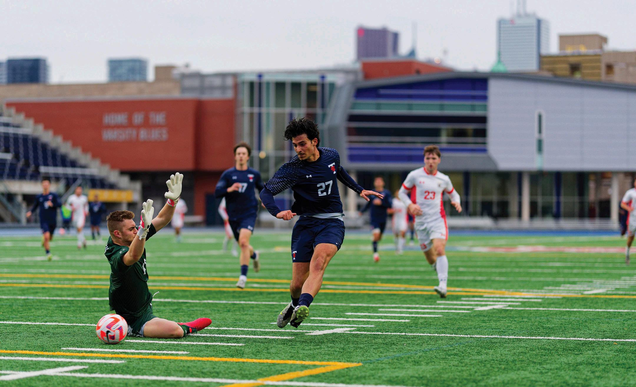 The Varsity Blues’ first round match against the eighth-seeded Université du Québec à TroisRivières (UQTR) Patriotes was dramatic and dynamic. At the end of the 90th minute, both teams were deadlocked at 2–2. UQTR looked
