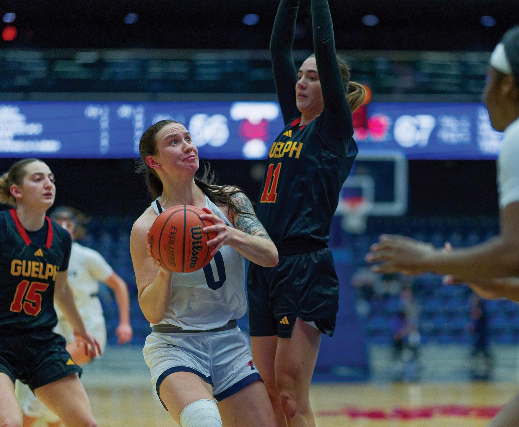 steals and seven rebounds. Fourth-year forward Janet Enge ended the match with 12 points, and second-year center Zi Yang Wang also fought hard in the key, scoring 10 points and securing seven rebounds. The Gryphons offence was led by Christina Morra’s 18 points, followed by Hannah Bourdon with 16 points and Macy Weber, who contributed another 12.