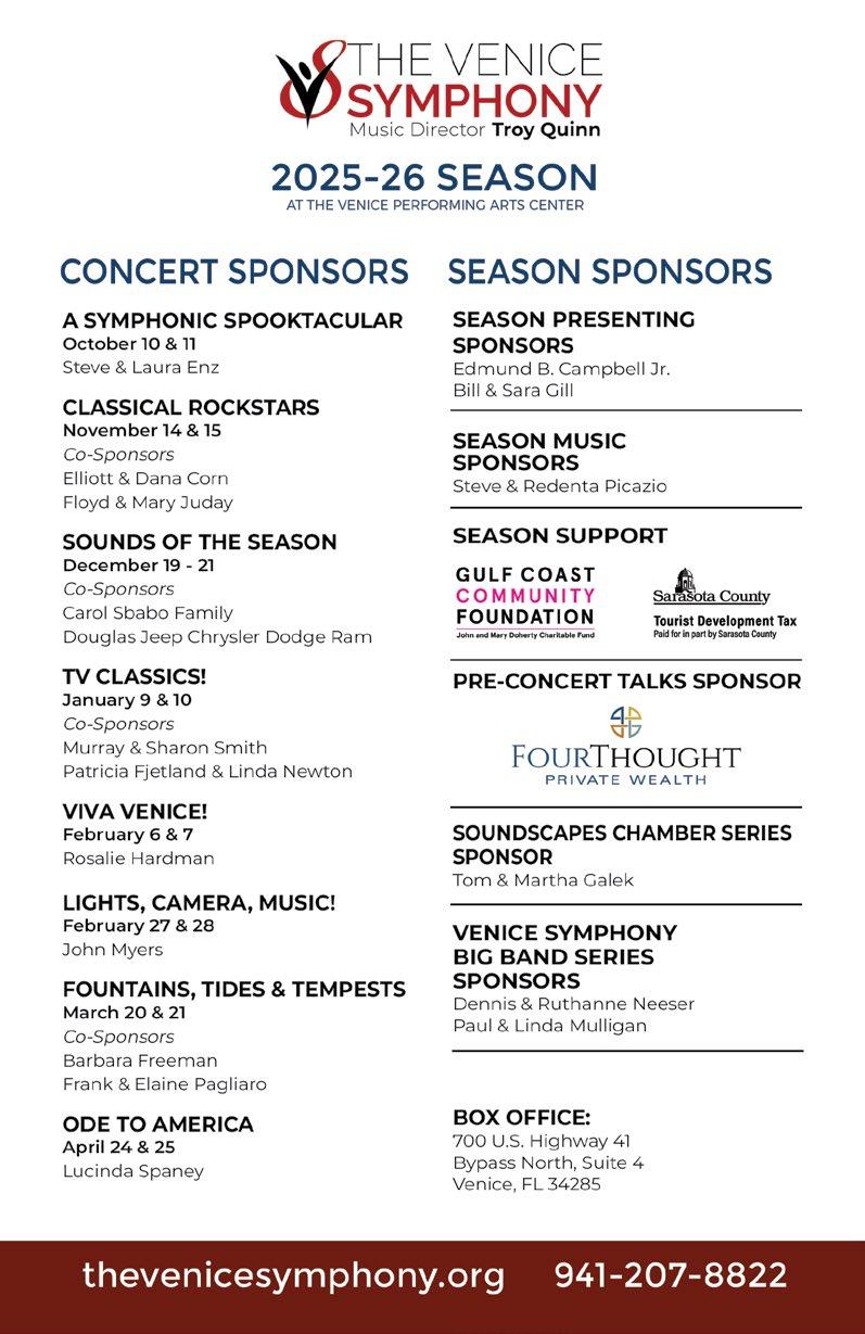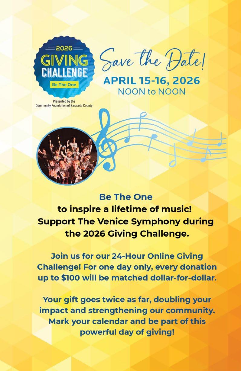 Thank you for being such an important part of The Venice Symphony family. Your support allows us to bring world-class artists, dynamic programming, and meaningful educational initiatives to our community. We’re grateful to have you with us this season and to share the music and memorable moments already unfolding on stage and in our community.