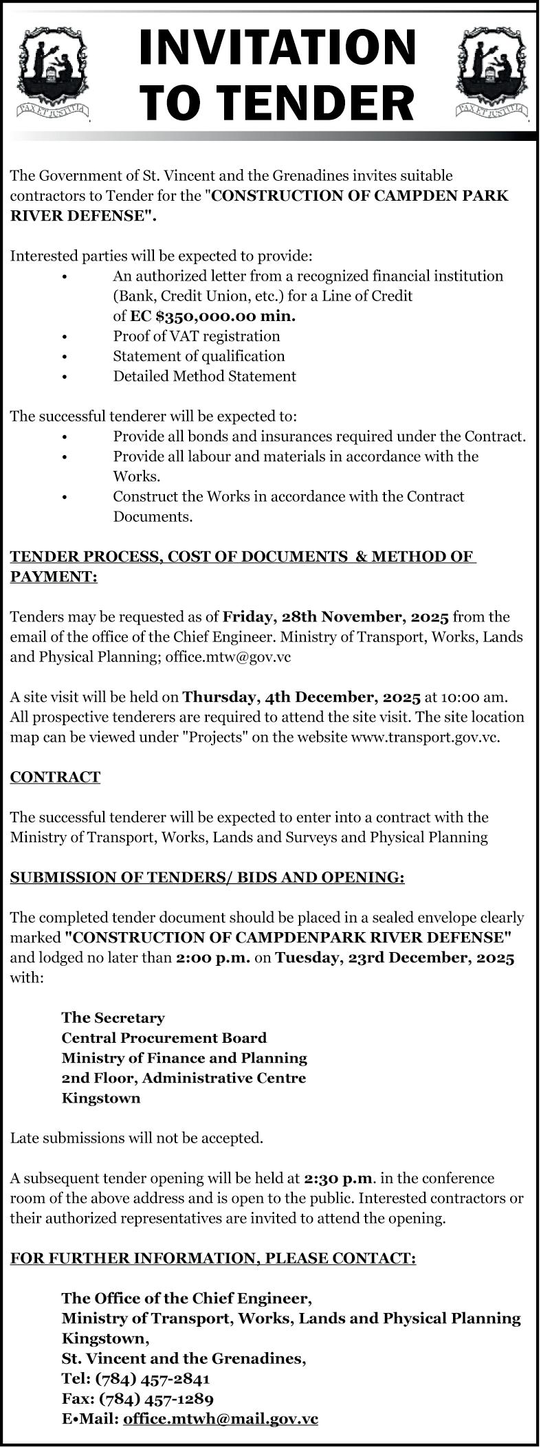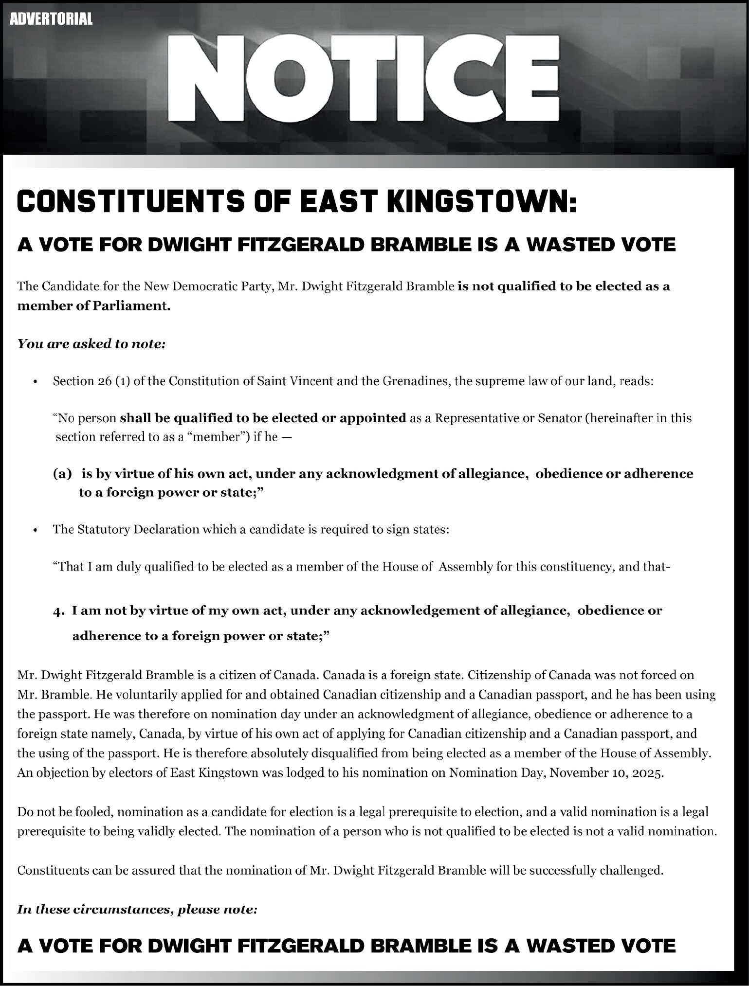 THE LIST OF CANDIDATES as of Monday 10th November, 2025, Nomination Day for the November 27, 2025 general election, shows St. Clair Leacock for the New Democratic Party (NDP) against new comer Marvin Fraser for the Unity Labour Party (ULP), in the Central Kingstown constituency.