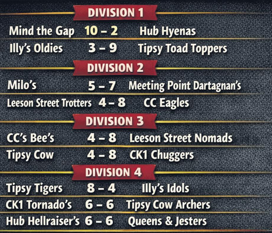 2x100, 180,140 took the 5th.Che Liam scoring 140 fought against Dave Bracken 135,125,100 but Liam won out on 125. POTM:Carret - Sierra Illy’s Oldies v Tipsy Toad Toppers