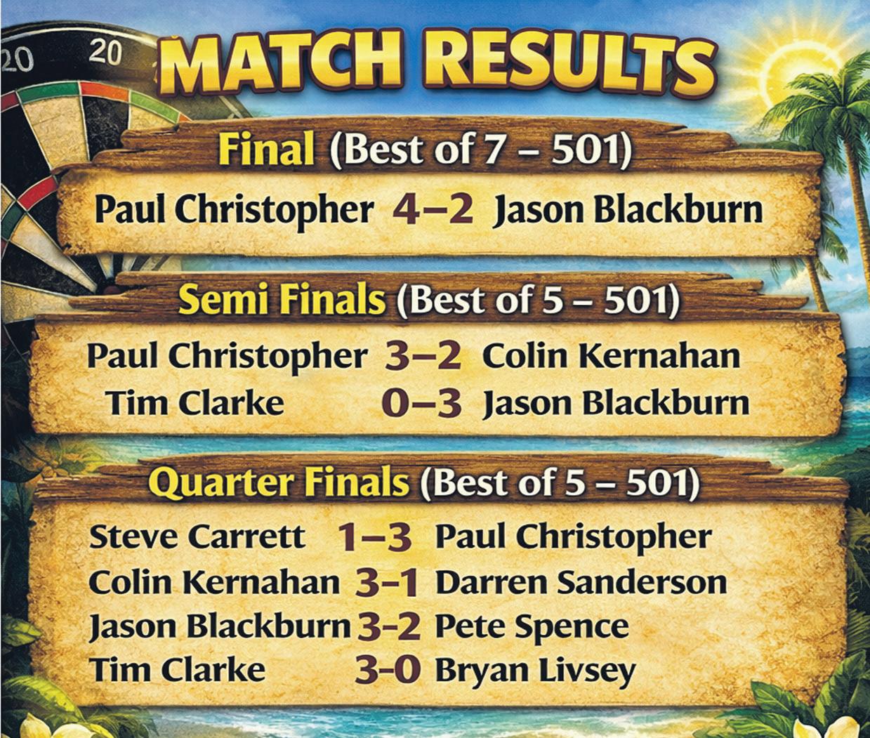 Christopher had advantage of throw in the 6th, both players hitting several 3 figure scores, the Eagle leaving 32, his opponent on 65. Blackburn never returned to the oche, Christopher nailing 32 for 4-2 and the title. Eighteen tons or more graced the final.