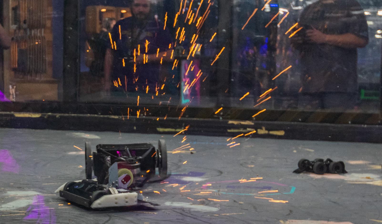 At the end of the all-day competition, the teams behind 30-pound wedge and vertical spinner equipped Emulsifier, UGEE the big wheeled 12-pound batterer and three-pound titanium-cleated Lynx each took home a “Golden Dumpster,” a brass plated miniature version of the NHRL’s boxy robotic referee “Brett.”