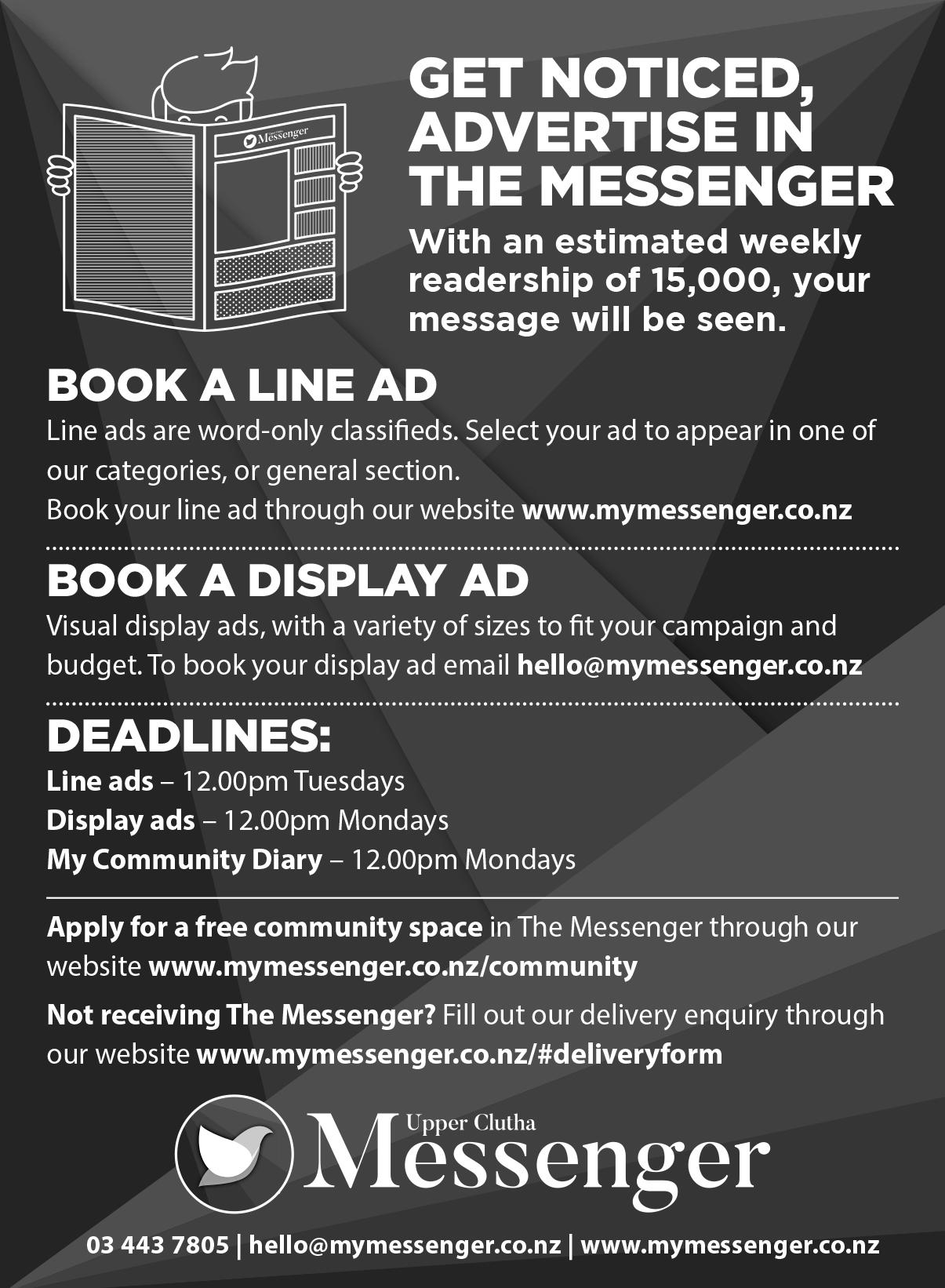 FREE LINE ADS in The Messenger for private advertisers. Terms and conditions apply. www.mymessenger.co.nz