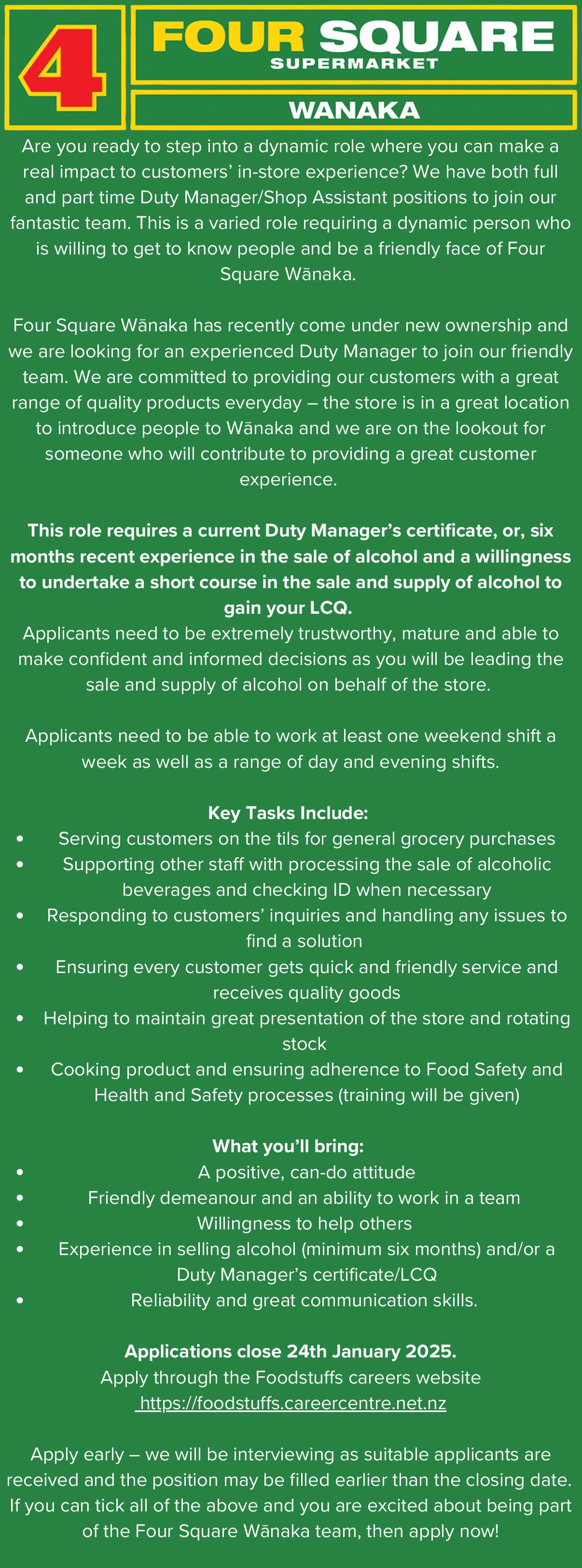 FOURSQUARE WANAKA IS looking for duty mangers and shop assistants. For more information check out their display ad in the colour section.
