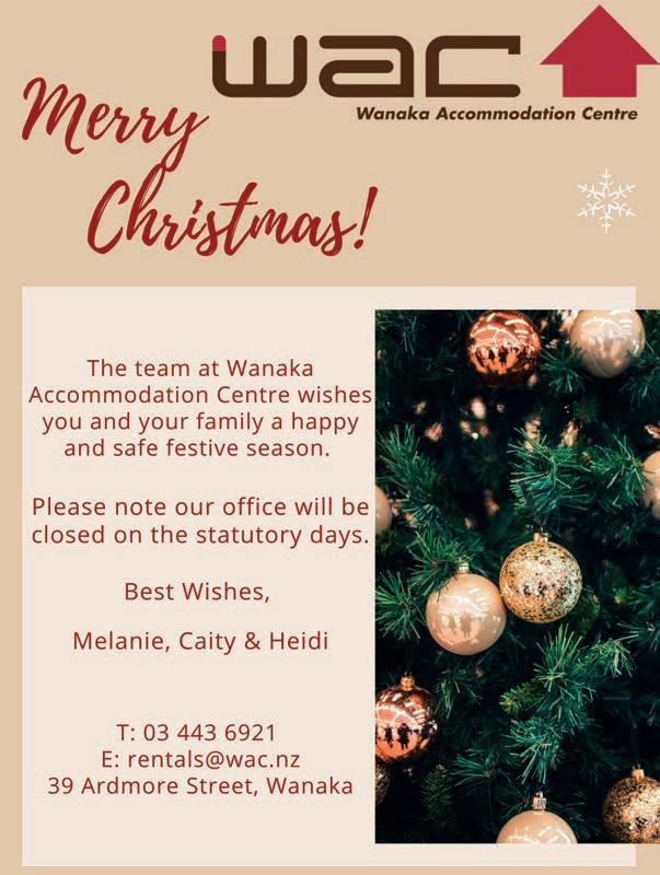 21st December 2022 Central Otago's Number ONE High Performance & Passive House Builders Call Emma on 027 294 6801 www.cbgconstruction.co.nz For the last 25 years our business has enjoyed serving our clients in the Upper Clutha as part of a franchise. We are happy to announce that since the 1st October 2022 we are now called Alpha Restoration Services. We have the same team, we do the same work, we have the same phone number. Andi, Lizette, Michael & Martin are here for you. Call ARS 03 443 1150 for all your FLOOD SERVICE, Carpet & Upholstery Cleaning, Rug Cleaning, Pest Control , Odour Restoration & Window Cleaning. P: 03 443 1150 E: info@alphars.nzwww.alphars.nz 03 456 5000 bookings@majesticmansions.co.nz majesticmansions.co.nz Located just metres from the beach, and minutes from the heart of Dunedin city. Our serviced one and twobedroom apartments are ideal for short and medium-term stays, for corporates, families and groups. 03 456 5000 bookings@majesticmansions.co.nz majesticmansions.co.nz Located just metres from the beach, and minutes from the heart of Dunedin city. Our serviced one and twobedroom apartments are ideal for short and medium-term stays, for corporates, families and groups. 03 456 5000 bookings@majesticmansions.co.nz majesticmansions.co.nz Located just metres from the beach, and minutes from the heart of Dunedin city. Our serviced one and bedroom apartments are ideal for short and medium-term stays, for corporates, families and groups. 03 456 5000 bookings@majesticmansions.co.nz majesticmansions.co.nz 03 456 5000 bookings@majesticmansions.co.nz majesticmansions.co.nz Located just metres from the beach, and minutes from the heart of Dunedin city. Our serviced one and two-bedroom apartments are ideal for short and medium-term stays, for corporates, families and groups. WANAKA FAMILY STORE Where you can donate, shop and support your local community Please visit us at: Unit 3-4, 10-12 Umbers Street, Three Parks Residential / Commercial / Lifestyle / Property Management ALTOGETHER BETTER Robert Anderson 027 443 8039 robert.anderson@bayleys.co.nz MAT ANDREWS REAL ESTATE LTD, BAYLEYS, LICENSED UNDER THE REA ACT 2008 We’d like to take the opportunity to wish everyone a safe and happy holiday season with family and friends. If you’re thinking of buying or selling in 2023, call the Andersons for friendly and professional service you can count on. Janet Anderson 027 229 3125 janet.anderson@bayleys.co.nz MAT ANDREWS REAL ESTATE LTD, BAYLEYS, LICENSED UNDER THE REA ACT 2008 TOW BAR INSTALLATIONS \ BATTERIES \ SNOW CHAINS \ TYRES CALL THE TEAM TODAY 03 443 8941 \ CNR FREDERICK ST & CONNELL TCE, WANAKA