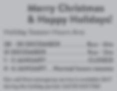 2 Upper Clutha Messenger 28th December 2022 Our o ce is closed from 23 Dec and will reopen on 4 Jan. Happy New Year from The Messenger team BOOK A LINE AD Line ads are word-only classi eds. Select your ad to appear in one of our categories, or general section.Book your line ad through our website www.mymessenger.co.nz BOOK A DISPLAY AD Visual display ads, with a variety of sizes to t your campaign and budget. To book your display ad email hello@mymessenger.co.nz DEADLINES: Line ads – 12.00pm Tuesdays Display ads – 12.00pm Mondays My Community Diary – 12.00pm Mondays Apply for a free community space in The Messenger through our website www.mymessenger.co.nz/community Not receiving The Messenger? Fill out our delivery enquiry through our website www.mymessenger.co.nz/#deliveryform GET NOTICED, ADVERTISE IN T E ESSEN ER With an estimated weekly readership of 15,000, your message will be seen. 03 443 7805 | hello@mymessenger.co.nz | www.mymessenger.co.nz WANT YOUR PET FEATURED? Emailentryto: ads@mymessenger.co.nz SPONSORED BY VetEnt Aspiring 2McCormickSt,Wanaka | 03 443 7262 Monday to Friday 8am - 6pm Saturday 9am - 2pm Dear valued customers VetEnt Aspiring 2 McCormick Street, Wanaka 9382 Check out our facebook page vetent.co.nz We are extending our opening hours from Monday 5th September Call 03 443 7262 - 24 hours Frankie Merry Christmas & Happy Holidays! HolidaySeasonHoursAre: 28 - 30 DECEMBER 8AM - 6PM 31 DECEMBER 9AM - 2PM 1 - 3 JANUARY ........................... CLOSED 4 -6 JANUARY .... Normal hours resume Our call-first emergency service is available 24/7 during the holiday period. Call 03 443 7262 If you would like us to include a birthday and give the gift of a free co ee phone 03 443 7805 or email hello@mymessenger.co.nz 30th Nicki Miller 31st Dominic Hunnisett Esme Pohatu 1st Eesh-kanu Saklani 2nd Gabrielle Hémond WANT YOUR OWN SPECIAL SUPERMARKET CAR PARK? Order online today Collect tomorrow We will bring your groceries to you! No rush, No fuss www.newworld.co.nz/shop appy N w Year to you an our loved o es FROM STUART, JACQUI AND THE NEW WORLD WANAKA TEAM