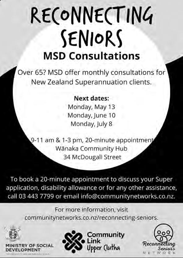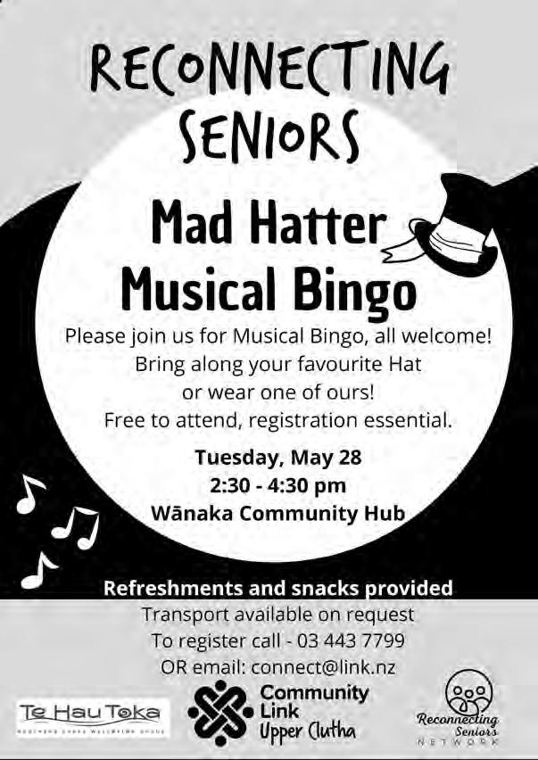 Morning tea and a chat. All seniors welcome! Next date: Monday, May 13. 10.0011.30am Reception, Wānaka Community Hub 34 McDougall Street