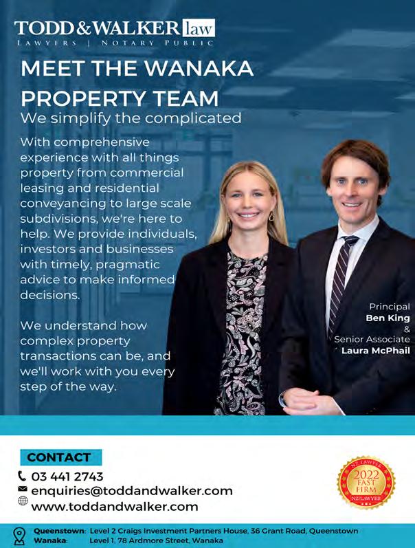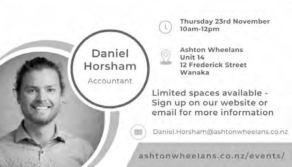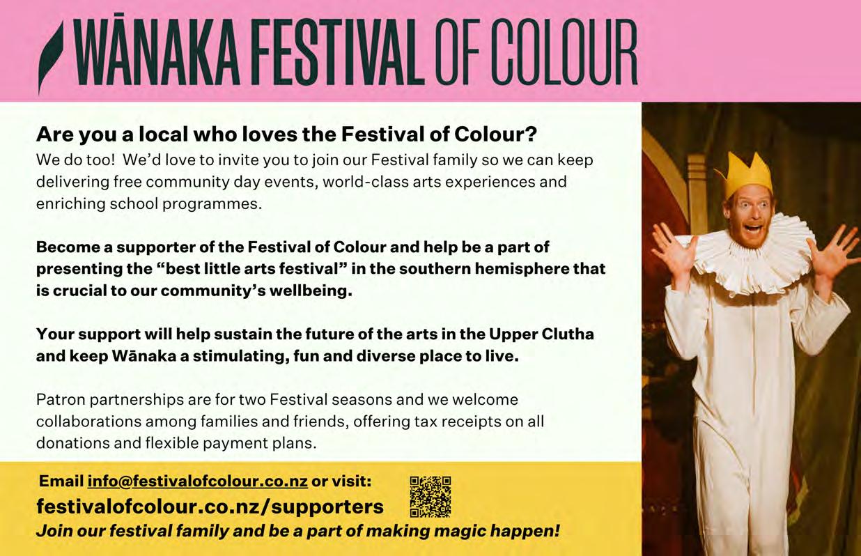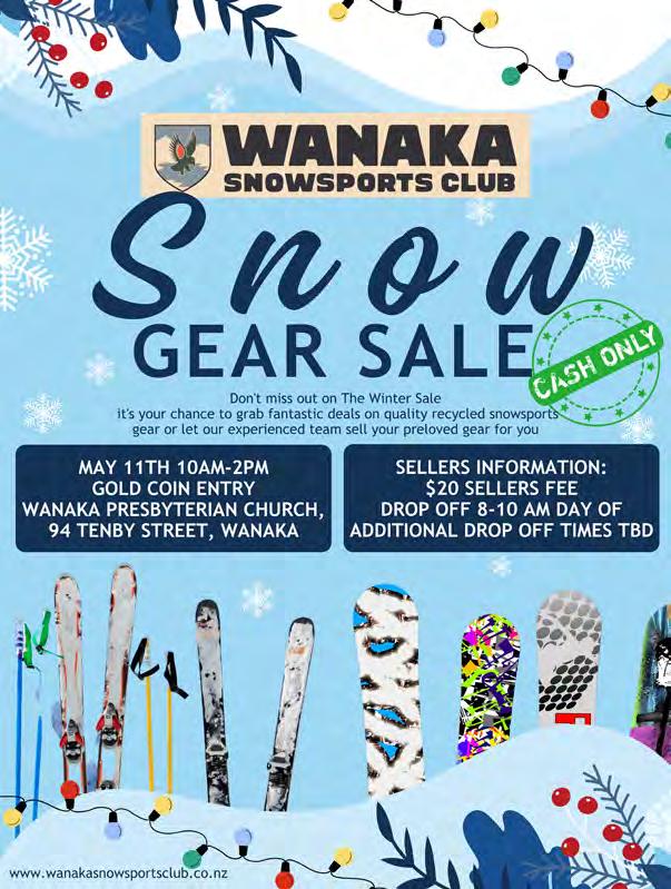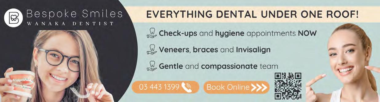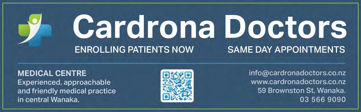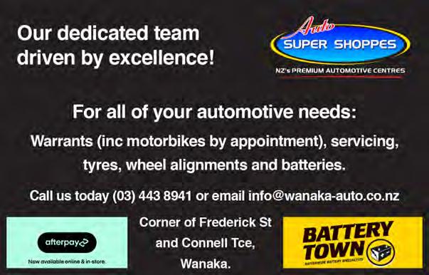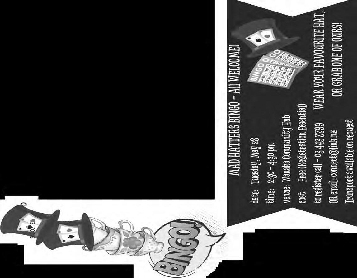 Rotary Club of Wanaka. 6.00pm, The Albie Tavern. New members welcome. Pat He ernan 021 569 890. Walking Group. Di erent weekly walk followed by co ee. Join New Life Ladies, ph 021 996 133 Heather. Bridge Club, Presbyterian Church, 91 Tenby Street. www.otagosouthlandbridge.org.nz/wanaka 11.15am, seated by 11.05am. Social. Bring lunch. Steady as you go Body Balance Class. 1.00pm and 2.00pm. St John Room, Link Way. All welcome. Entry $2. 027 2851 095.