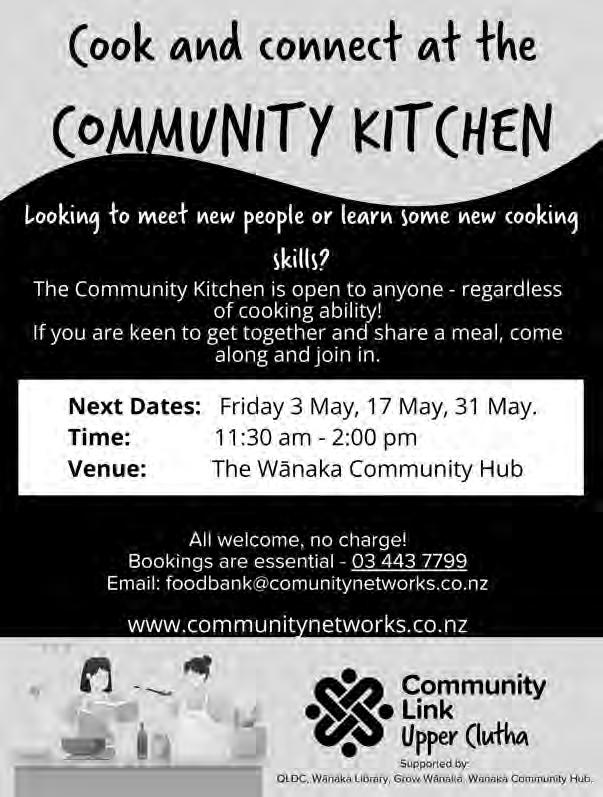 Community Kitchen: c ook, con nect a nd e njoy a shared lu nc hno sk il ls req u ired E ver y othe r Friday I 1 1.30am2. 00pm W ana ka Comm unity H ub Book in g es sent ial. Con tact Commu ni ty Netwo rks /L INK: 0 3 4 43 77 99 office@communitynetworks.co.nz
