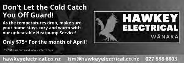 Upper Clutha Messenger 3rd April 2024 03 443 4162 027 251 5147 info@advancedcarpet.co.nz www.advancedcarpet.co.nz TODAYCALLUS FORA FREEQUOTE Get in touch with us TODAY to see our results on your carpets. We use the most effective and efficient carpet cleaning technology. Give the gift of relaxation with an Edgewater Gift Card Enjoy an unforgettable stay in our newly refurbished rooms or dine at our lakefront restaurant. See our website for more. Gift Card • EXCAVATION • GRAVEL & TOPSOIL SUPPLIES • ROCKWALLS • LARGE & SMALL DIGGER WORK www.wanakasiteworks.co.nz JAMES BISHOP | 027 965 5066 E: wanakasiteworks@gmail.com • TRENCHING • DRILLING & BORING • DRIVEWAYS • LANDSCAPING