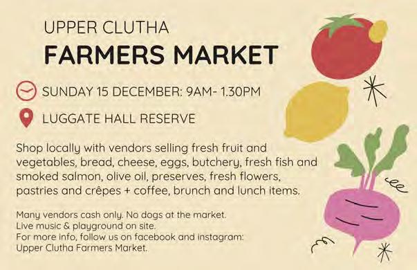 Indoor market, Lake Hawea Community Centre, 10.00am3.00pm, free entry. Co ee, tea, cakes available to purchase. Nine Lessons and Carols at St Columba’s Church, 7.00pm. Everyone welcome.
