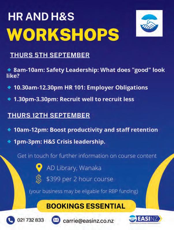 Dementia Carer Support Group. 10.00am, Wanaka Hotel. Inquiries to robyn@alzheimersotago.org.nz 027 4414 001. Wanaka Painters’ Group at Wanaka Arts Centre, 9.30am - 12.00pm. $5, all welcome. Enquiries 027 4424 662.