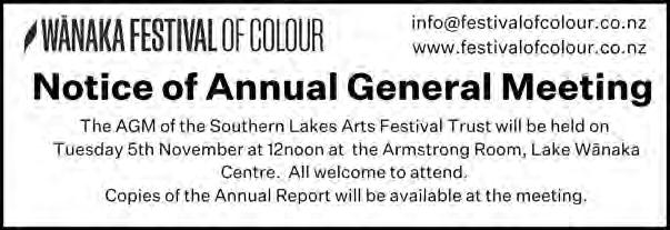 Meditation, 12.15pm at St Columba’s Anglican Church. Wanaka Woolcrafters (Creative Fibre) meets at The Community Hub from 11.00am - 3.00pm. All welcome. Enquiries to Rose 021 0390 025.