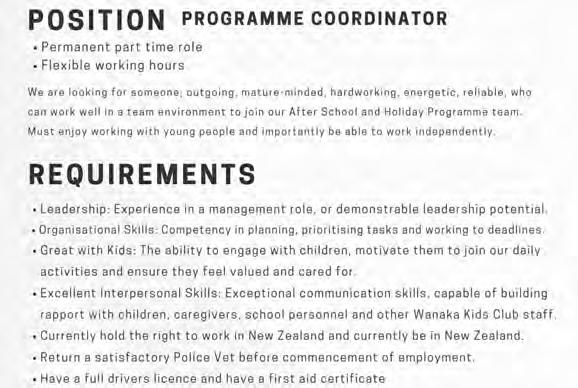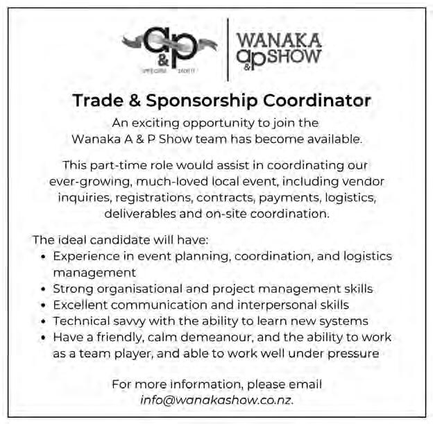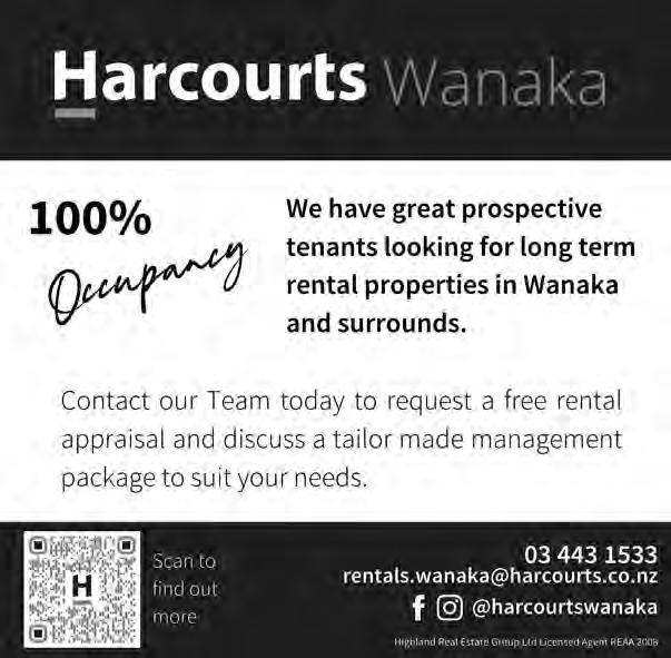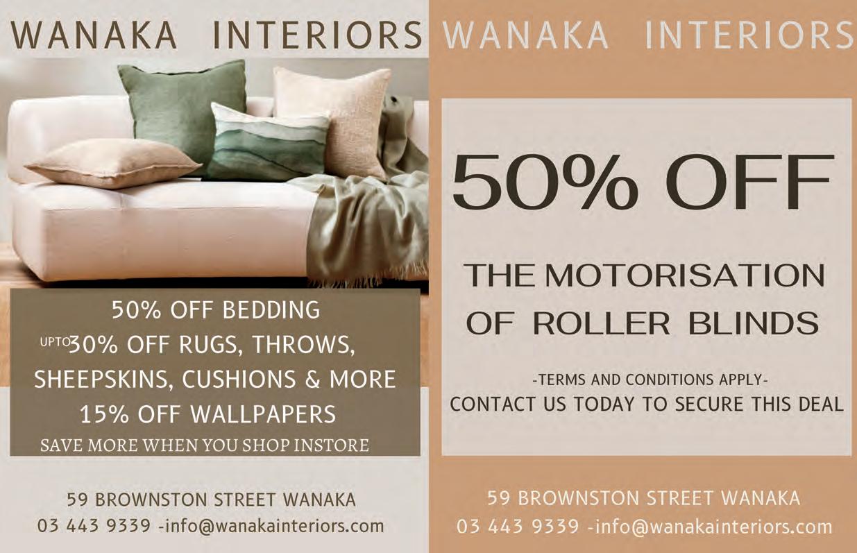is the safe, efficient and affordable way to help avoid flooding, damaged gutters and costly repairs. Reaches 12m high; no ladders, no scaffolding, no mess, camera for precision. Tel: 027 423 5098 Socials: @adlibrary.nz Web: www.adlibrary.nz 2 FREDERICK ST. AD LIBRARY WANAKA A PLACE FOR YOUR COFFEE CUP? A desk would help. MAY OFFER PAY FOR ONE DAY STAY FOR TWO! NEW & USED VEHICLE SALES Service Department We offer a full range of genuine Honda Parts and can arrange full vehicle servicing options, for all makes and models. $65 CAR WOF’s 1/1 Sir Tim Wallis Drive, Three Parks, Wanaka | 03 443 1317