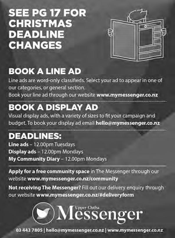 WHY DOES MESSENGER advertising work? Because your target market is searching for your ad - make it work for you. Book online, or by email. It is easy to place your advert - www.mymessenger.co.nz or email: hello@mymessenger.co.nz