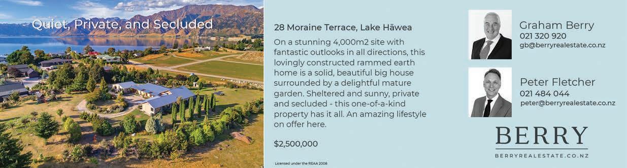Upper Clutha Messenger 20 th September 2023 1/28 HELWICK ST, WANAKA WANAKA@PENZL.CO.NZ | +64 3 243 3100 PACIFICENVIRONMENTS.CO.NZ ARCHITECTURE INTERIOR DESIGN URBAN DESIGN MASTER PLANNING REGENERATIVE DESIGN New facility launch and community open day Sunday 1 October 11.30am – 11.35am Ribbon cutting ceremony 11.35am - 1.30pm Open Day Paetara Aspiring Central, 35 Plantation Road, Wānaka 9305 The old Mitre10 building! Join us for an exciting launch featuring sport and activities for all. Scan QR code for more. WHEN WHERE WHAT +642041204596 INFO@ASPIRINGIMMIGRATION.KIWI ASPIRINGIMMIGRATION.KIWI YOURLOCAL IMMIGRATIONADVISER NZVisaandImmigrationassistance EmployersAccreditationandJobChecks MigrantEmploymentandRecruitment TATIANAELVERY DIGGER, TRUCK, TRACTOR HEAVY DUTY BATTERIES 1 Connell Terrace, Wanaka. 03 443 8941 Your morning co ee companion, since 1978