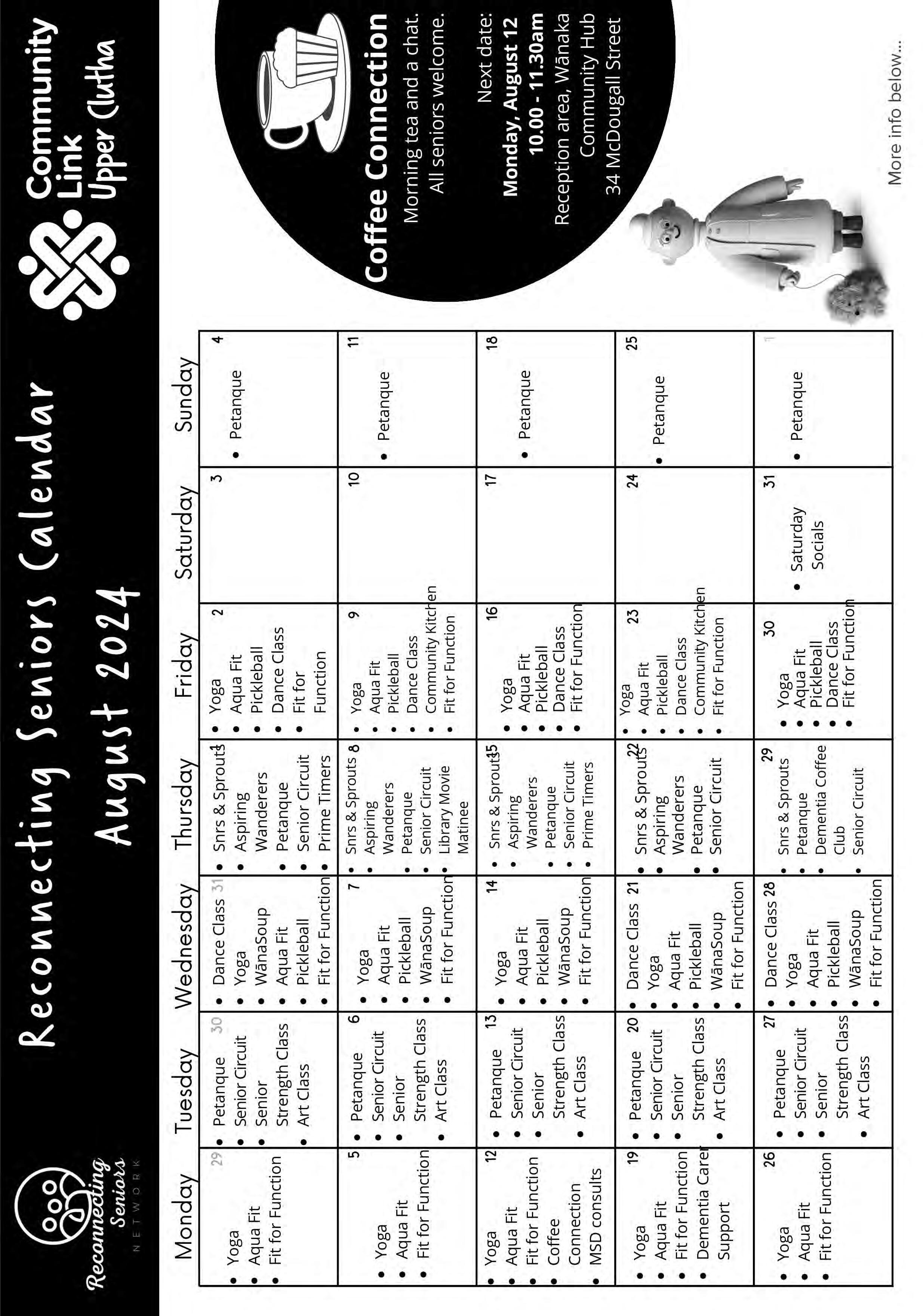 Wanaka Walking Group. 10.30am. Meet at the Wanaka Water Sports Facility Carpark. Walk time 1 hour. 027 2108 109. Petanque Wanaka. 10.00am - 12.00pm. Grace Wright Drive. New members welcome. Enquiries Mary 021 0690 374.