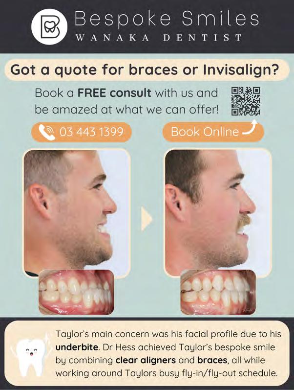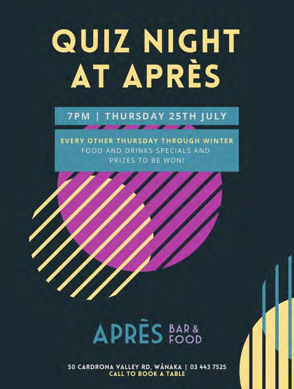 Lake Hawea Knitting Group. 12.30pm, Lake Hawea Library. Denise 021 0378 347. Justice of the Peace - Community Networks located at 34 McDougall Street. 1.00 - 2.00pm. Bookings at www.communitylink.nz or call 03 443 7799. Rotary Club of Wanaka. 6.00pm, The Albie Tavern. New members welcome. Pat He ernan 021 569 890. Walking Group. Di erent weekly walk followed by co ee. Join New Life Ladies, ph 021 996 133 Heather. Bridge Club, Presbyterian Church, 91 Tenby Street. www.otagosouthlandbridge.org.nz/wanaka 11.15am, seated by 11.05am. Social. Bring lunch.