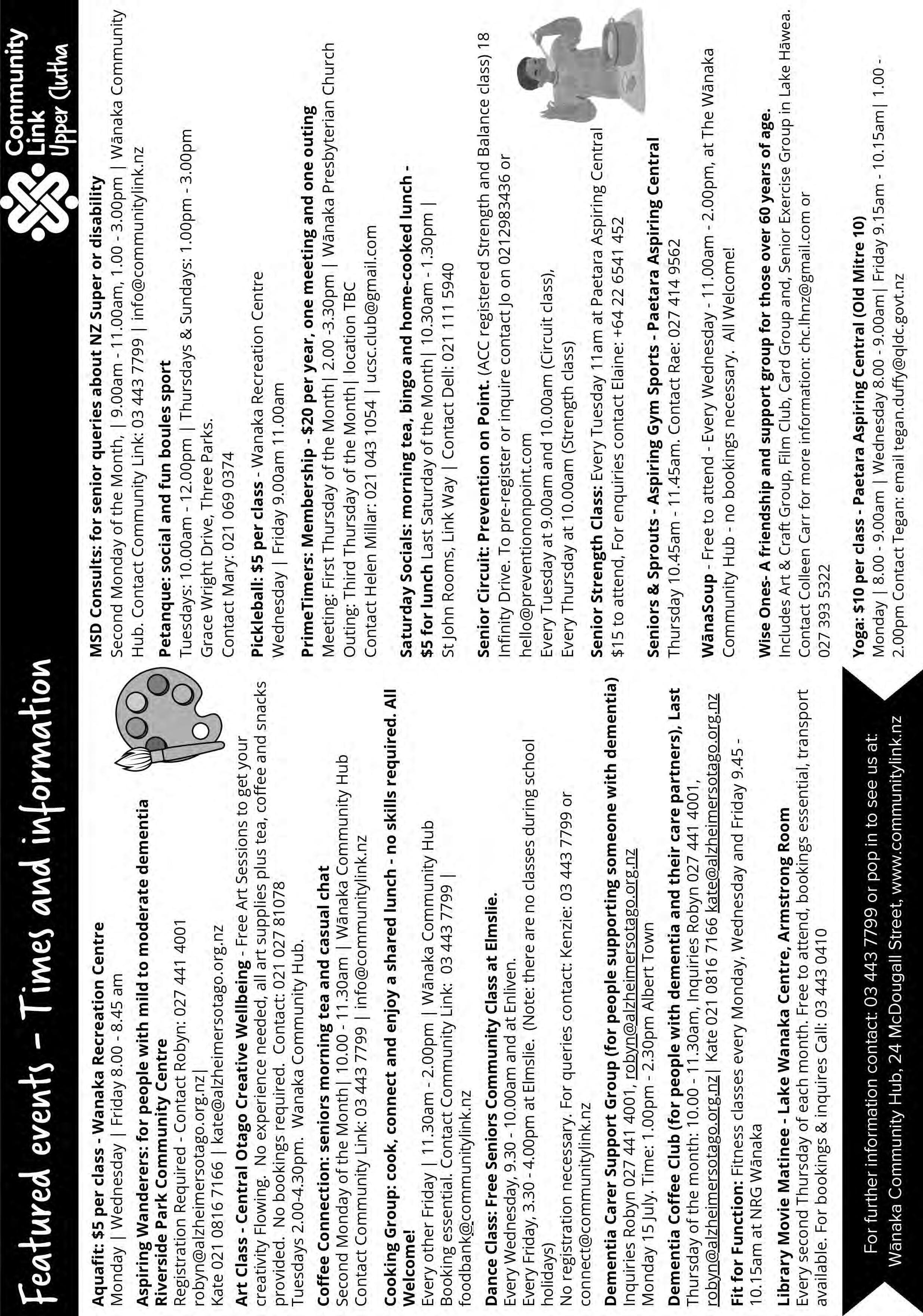 Petanque Wanaka. 1.00 - 3.00pm. Grace Wright Drive. New members welcome. Enquiries Mary 021 0690 374. Wanaka Community Workshop. Volunteer with MenShed and Fabricate 9.00am - 12.00pm, 15 Gordon Road. Dementia Co ee Group. For people with dementia and families. 10.00am Albert Town. Info 027 4414 001 or robyn@alzheimersotago.org.nz