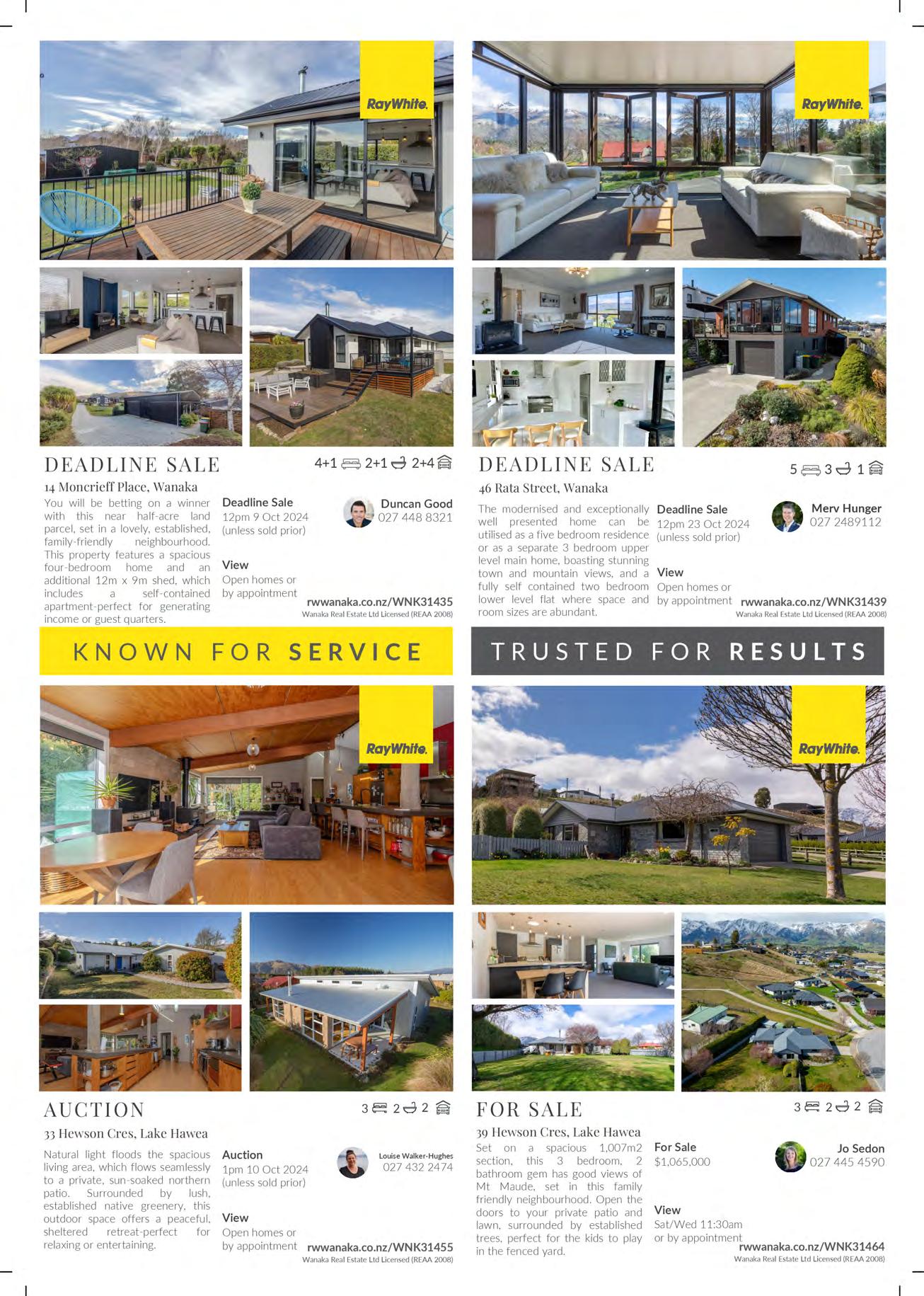 Matai Road, Wanaka 10.00 - 11.00amSat 28 Sep $2,299,000 26 Meadowstone Drive, Wanaka 11.00 - 11.30amSat 28 SepAuction 23/10