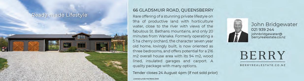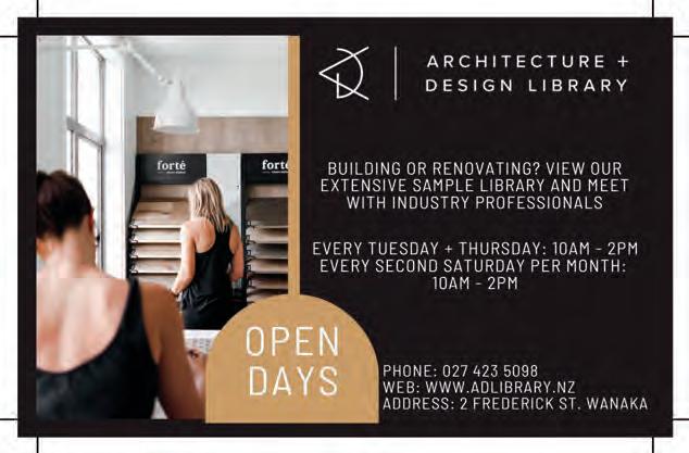 Helping New Zealanders do more Whether it’s a new car for the family, a boat for the lake or equipment for the business, MTF Finance Central Otago can help. Offer of finance is subject to terms, conditions, lending criteria, responsible lending inquiries and checks. See mtf.co.nz/terms for details. mtf.co.nz/centralotago Julia Bentley 027 722 0027 julia.bentley@mtf.co.nz Fi Sim 027 433 5511 fi.sim@mtf.co.nz Call Julia or Fi today sushimii_wanaka sushimiiwanaka S USHI MII WANAKA Fresh Sushi Made Daily - Open 7 Days a Week Located behind The Doughbin Bakery, 139 Ardmore Street, Wanaka. Open 8am to 7pm everyday. www.sushiwanaka.co.nz www.smitheramsbuilding.co.nz Full contract builds available