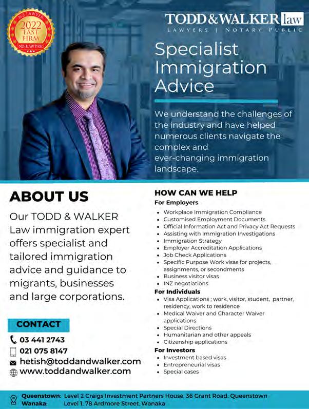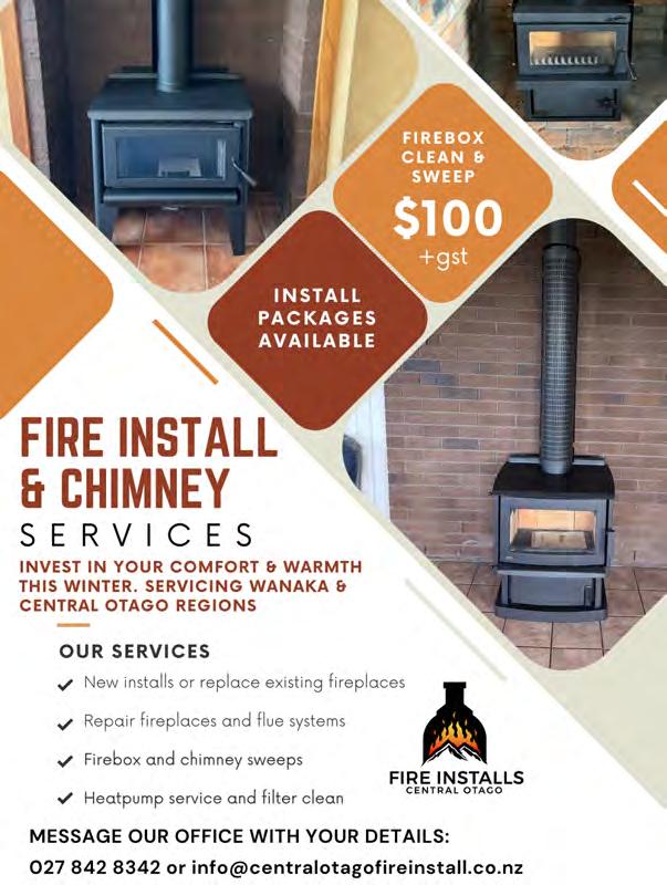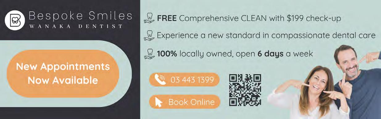 Upper Clutha Messenger email info@easyvisa.co.nz phone 03 443 8386 www.easyvisa.co.nz FULLY LICENSED AND EXPERIENCED Immigration Advisers Contact Angela or Charles today INFO@WANAKAHELICOPTERS.CO.NZ 0800 46 36 26 OR 03 443 1085info@wanakahelicopters.co.nz 0800 46 36 26 OR 03 443 1085 WANAKA HELICOPTERS SCENIC FLIGHTS BOOK NOW www.wanakahelicopters.co.nz Breathtaking daily scenic flights exploring Wānaka, Mt Aspiring National Park, Milford Sound and the West Coast. Flights from $295pp 10AM-1PM Wanaka ALTA Villas, Northlake Alpine luxury at ALTA Villas • Luxury three and four bedroom villas • Offering you everything you need and nothing you don’t • Designed to take advantage of the alpine views and provide an abundance of natural light • A quality investment in a spectacular location Priced from $1,300,000 View by appointment Sharon Donnelly 027 561 7235 sharon.donnelly@bayleys.co.nz Scott McGoun 021 201 9029 scott.mcgoun@bayleys.co.nz 3-4 1-2 2.5 2 Grab a coffee on us! LAKE WANAKA REALTY LTD, BAYLEYS, LICENSED UNDER THE REA ACT 2008 OPENDAY EASTERMONDAY 03 443 4162 027 251 5147 info@advancedcarpet.co.nz www.advancedcarpet.co.nz FREETODAYFORA QUOTE Get in touch with us TODAY to see our results on your carpets. We use the most effective and efficient carpet cleaning technology. Andy - 021 122 9934 info@wanakatreecare.co.nz Experienced - Qualified - Professional Arborists
