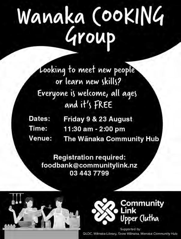 Line Dancing. Hawea Community Centre, 1.30 - 2.30pm. $5 entry to cover hall hire. Adults only. All welcome. Stitch Sisters - fun, inspiring, community knitting group. Edgewater 9.30am. Love for you to join. Bridge Club, Presbyterian Church, 91 Tenby Street. www.otagosouthlandbridge.org.nz/wanaka 6.30pm, seated 6.20pm. Bronze Champ Pairs 8. Pre-school Story-time. Wanaka Library. 10.00 - 11.00am 3 - 5 years. Stories followed by craft activity. All welcome, free. WanaSoup - All welcome for free warm soup 11.00am2.00pm. Wanaka Community Hub, 34 McDougall Street. Volunteer for habitat restoration at Te Kakano’s community native plant nursery. 1.00 - 4.00pm. All welcome! info@tekakano.org.nz