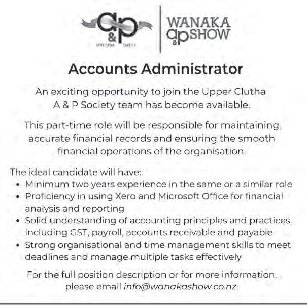 Ready to join a warm and inclusive team that genuinely values their people and clients Accounting Opportunity at the r’s edge BED & BREAKFAST Stay in a Lakeview Hotel Room for $249 or a Lakeview Apartment for $299. Breakfast for two included. Book before the 15 June *Stay period valid from 15 May - 30 June www.palomawanaka.co.nz | bookings@palomawanaka.co.nz | 03 443 1288 28 | Helwick Street, Wanaka 9305.