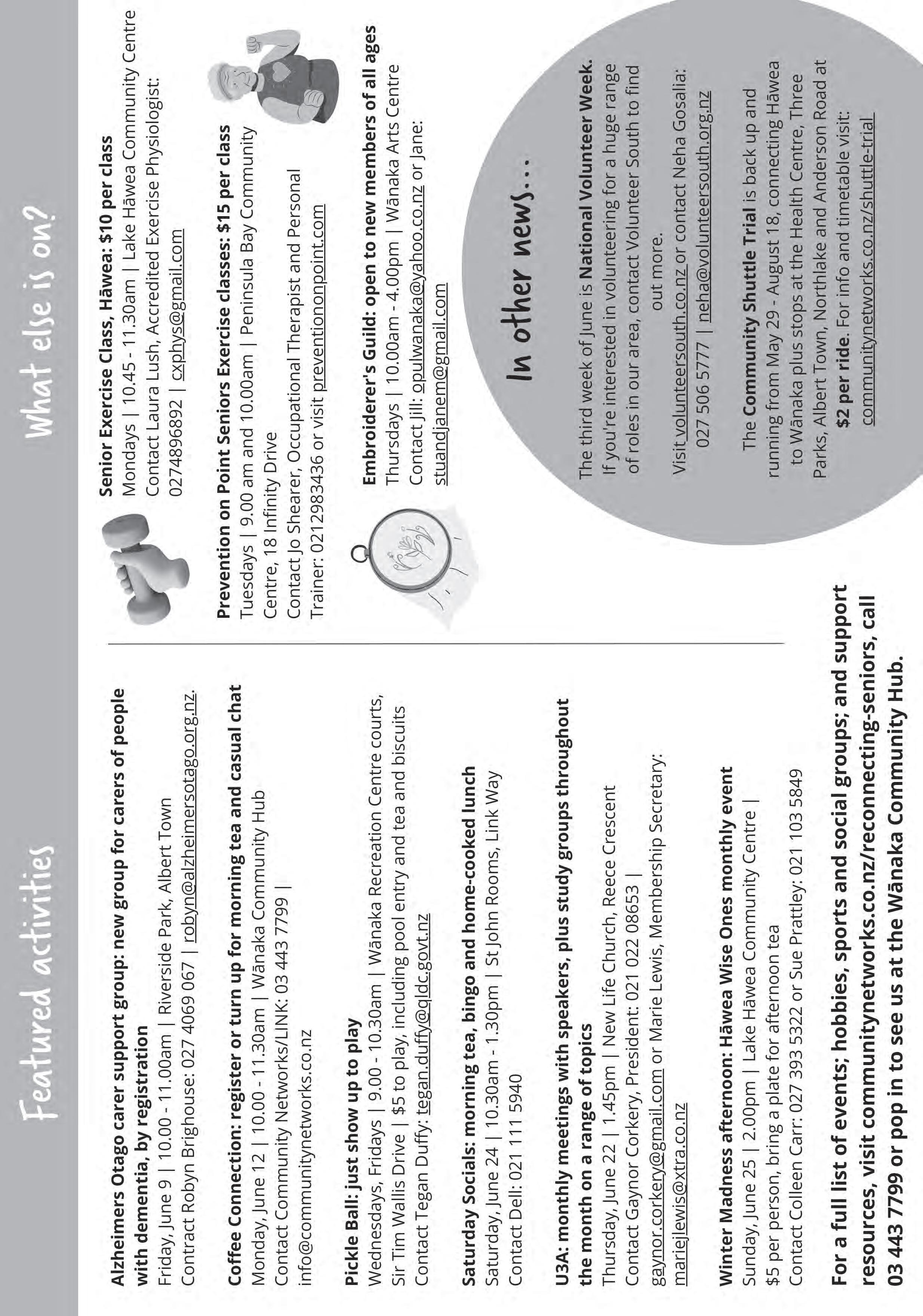 Wanaka Playgroup. 9.30am - 12.30pm. All welcome, kids age 0-6. The squash club, 21 Stone Street. Aspiring Wanderers Club. For people with mild-moderate dementia. 10.00am - 1.00pm, Albert Town. Contact robyn@alzheimersotago.org.nz or 027 4069 067.