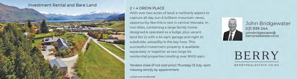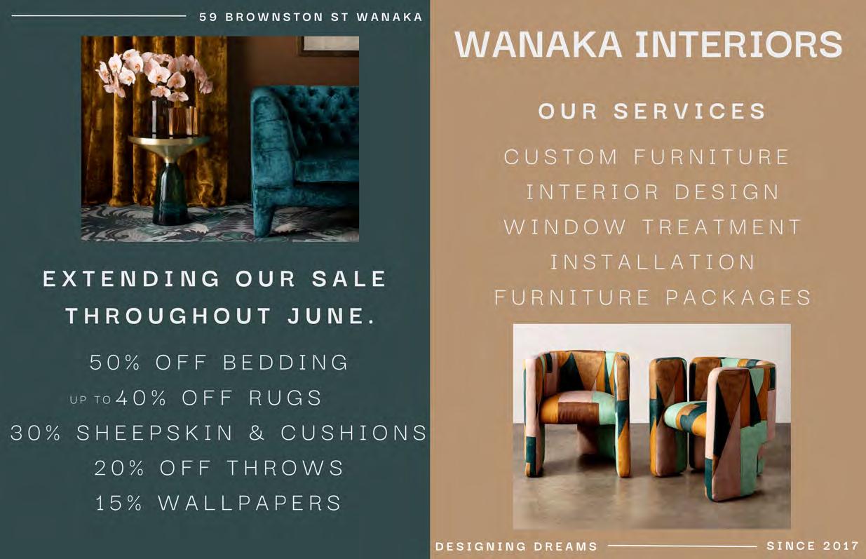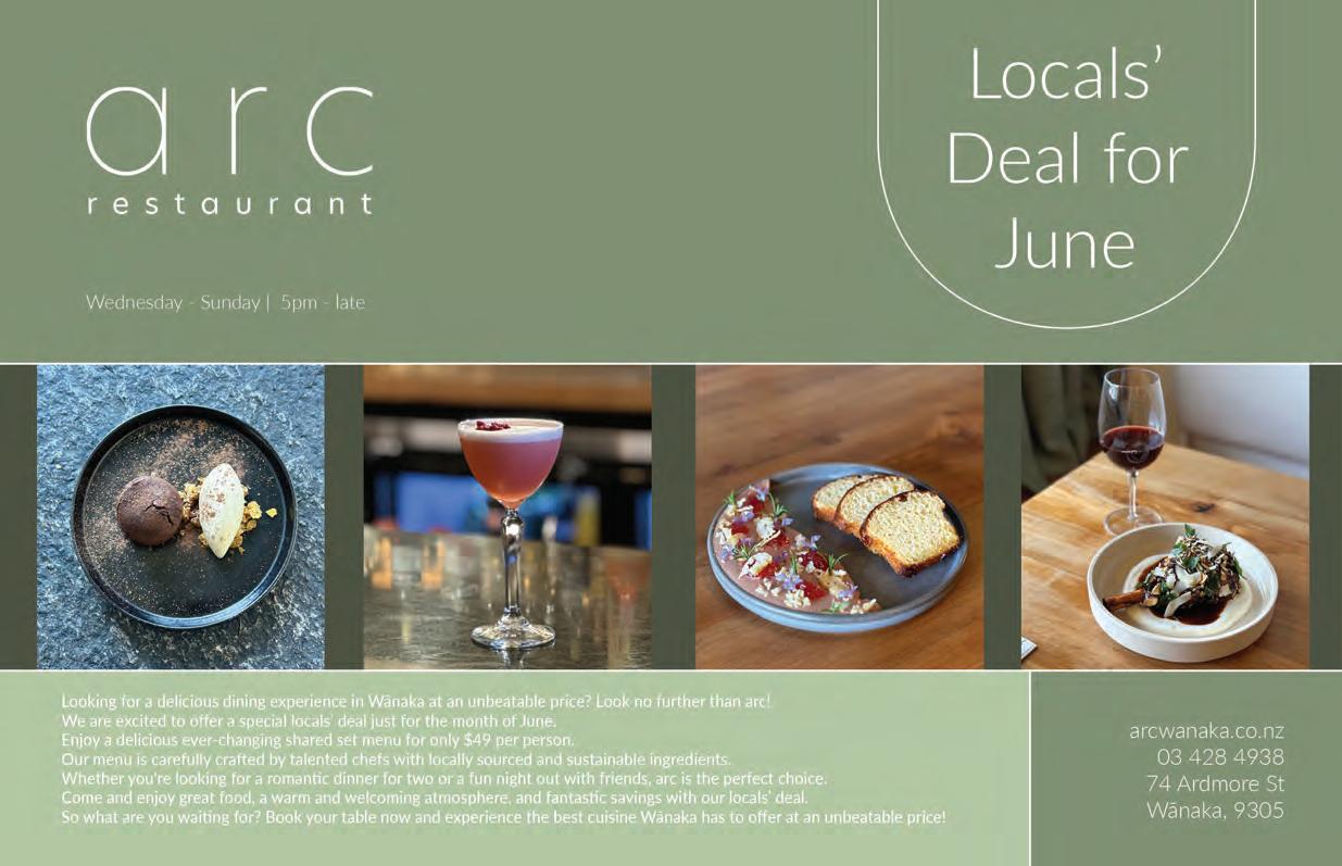 31st May 2023 WE’RE THE LAST THING ON KIM’S MIND. THE RENEWABLE ENERGY EXPERTS Call solarZero on 03 443 2212 or visit solarzerocentralotago.co.nz today. At solarZero we take a load off your mind and your electricity bill with cheaper, cleaner and more reliable energy. Subscribe to our comprehensive, no-fuss energy service that can deliver 100% of your power needs from Toitū certified carbon positive energy. You’ll also benefit from backup electricity during outages and will never be charged with any hardware, repair or replacement costs. Helping New Zealanders do more Whether it’s a new car for the family, a boat for the lake or equipment for the business, MTF Finance Central Otago can help. Offer of finance is subject to terms, conditions, lending criteria, responsible lending inquiries and checks. See mtf.co.nz/terms for details. mtf.co.nz/centralotago Julia Bentley 027 722 0027 julia.bentley@mtf.co.nz Fi Sim 027 433 5511 fi.sim@mtf.co.nz Call Julia or Fi today KING’S BIRTHDAY at the water’s edge Join us on Monday 5th June for a Winter’s Roast. Choose from a selection of meats; Roast Lamb Leg, Roast Pure South Beef or Slow Braised Pork Belly Roast Vegetables, Yorkshire Pudding, Pigs in Blankets & Duck Fat Potatoes. accompanied with $28 - Available from 12pm Bookings recommended +64 3 443 0011 edgewater.co.nz NEW & USED VEHICLE SALES Service Department We offer a full range of genuine Honda Parts and can arrange full vehicle servicing options, for all makes and models. $65 CAR WOF’s 1/1 Sir Tim Wallis Drive, Three Parks, Wanaka | 03 443 1317 Your Friendly Local Store 7.00am to 10.00pm 70 Ardmore St, Wanaka