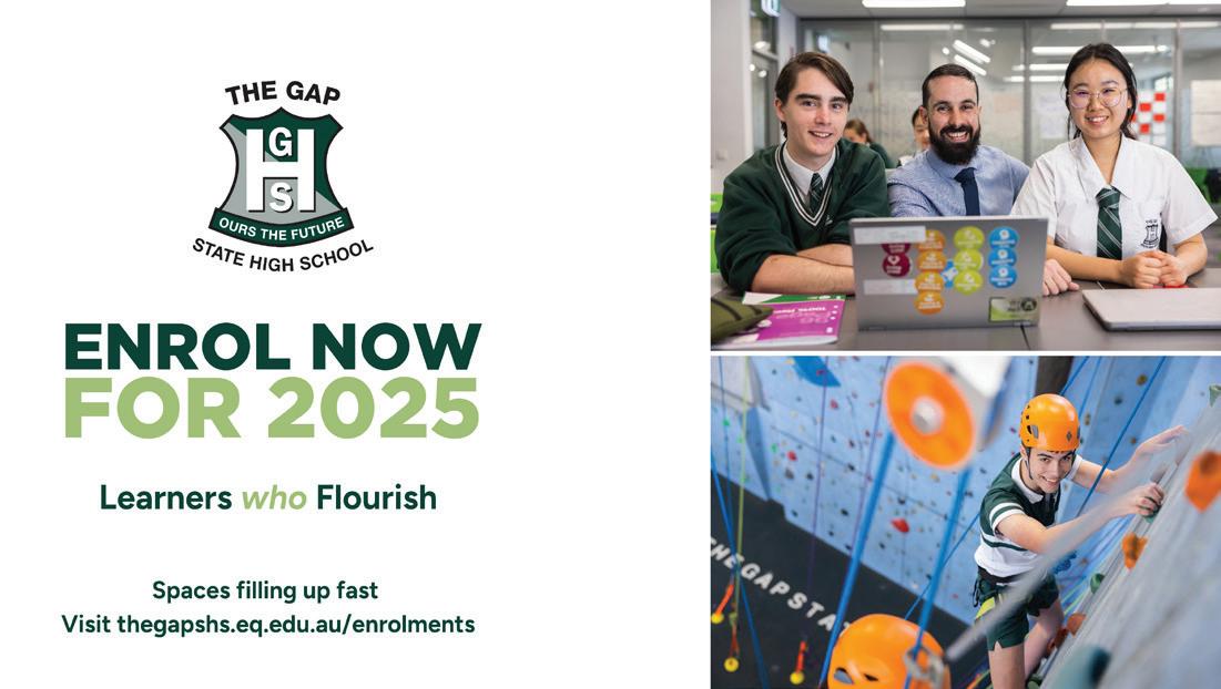 The Gap State High School enrolments for 2025 are filling up fast. If you haven’t done so, make sure you submit your applications straight away. If you are for looking for your child’s high school for 2026 and beyond, come along to our upcoming school tours on 26 July and 6 September. Register online at https://thegapshs.eq.edu.au/ enrolments/school-tours