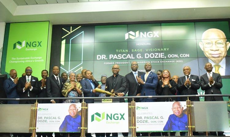 Gabriel Idahosa, president and chairman of Council, LCCI; Jude Chiemeka, CEO, Nigerian Exchange Limited (NGX); Oscar Onyema, immediate past Group CEO, Nigerian Exchange Group (NGX Group); Raymond Obieri, Past President of Council, NSE; Fatima Wali-Abdurrahman, Director, NGX Group; Niyi Yusuf, Chairman, NESG; Chidi Dozie, Grandson of late Pascal Dozie; Alhaji (Dr) Umaru Kwairanga, Group Chairman, NGX Group; Uzoma Dozie, and Kelechi Dozie, both Sons of late Pascal Dozie; Temi Popoola, GMD/CEO, NGX Group; Olufemi Akinsanya, Chairman, NGX RegCo; Elizabeth Ebi, GMD/CEO, Futureview Financial Services Ltd; Emmanuel Ikazoboh, former Interim Administrator, NSE; and Frank Aigbogun, Publisher, BusinessDay, during an afternoon of tributes and special closing gong ceremony in honour of Pascal Dozie, in Lagos, recently.