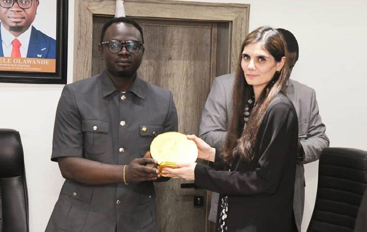 Minister of Youth Development, Comrade Ayodele Olawande (l), presenting a souvenir to the leader delegation, Tanya Singh, during the visit of a delegation from Google to the Minister’s office in Abuja on May 9, 2025.