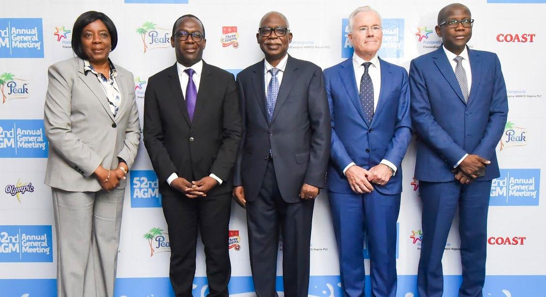 L-R: Non-Executive Director, FrieslandCampina WAMCO Nigeria Plc, Oyinkan Ade-Ajayi; Managing Director, Roger Adou; Chairman, Board of Directors, Moyo Ajekigbe; Non-Executive Director, Roel van Neerbos; and Non-Executive Director, Olayinka Sanni, during the 52nd Annual General Meeting of FrieslandCampina WAMCO Nigeria Plc, held in Lagos on May 8, 2025.
