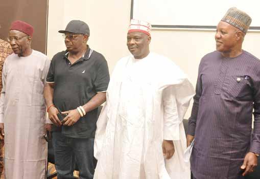 L-R: Chieftain, New Nigeria Peoples Party (NNPP), Buba Galadima; Chairman, Board of Trustee NNPP, Dr. Boniface Aniebonam; Presidential Candidate, NNPP, Rabiu Kwankwaso and President, Nigeria Guild of Editors, Mustapha Isa, during an interactive section with the Nigeria Guild of Editors (NGE), in Lagos on November 20, 2022.