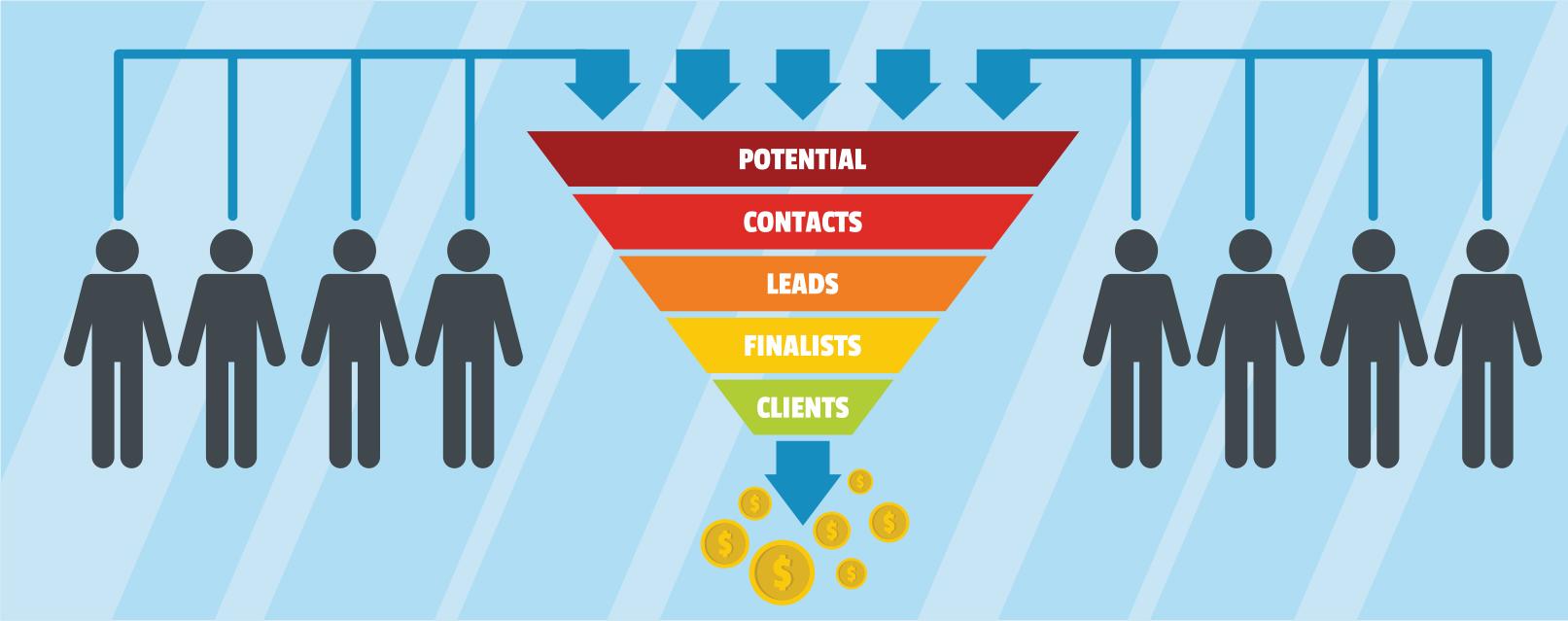 Leads are consumers or businesses that may be potential customers. Finding leads is the first stage of the sales cycle, and it’s a critical one. A sales pipeline is actually shaped more like a funnel than a pipe: it’s widest at the beginning of the sales process because you’ll lose a percentage of your prospects during each stage of the sales cycle. By the time you reach the last stage, you will likely have only a small fraction left of the initial group of prospects. So if you don’t come up with significant numbers of leads, you’ll be awfully short on potential customers by the end of the sales process.