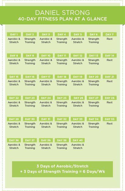 We will show you how easy it can be to move your body over the next 40 days with an easy-to-follow plan. First, you will see a 40day plan at a glance and then a more detailed, day-by-day, 10-day tness schedule. This 10-day program will provide you with a template to create your own Daniel Strong Fitness plan, allowing you to exchange exercises you may prefer in place of our suggestions. We have also provided you with varying levels of exercise to choose from, based on your time constraints, goals, interests, and a way to safely make progress. We have also provided you with your next steps after your 40-day Daniel Strong Fitness Challenge has been completed.
