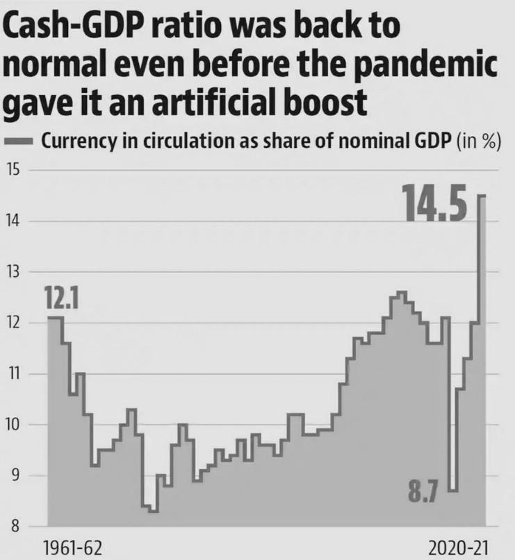 On 8 November 2016 PM Modi withdrawn the circulation of currency notes Rupees500andRupees1000Whichwere86%ofcurrencyincirculationatthat time.RBIdatashowedthatthecashincirculationReachedanall-timehighon October8thof28.3trillion,whichprovescacheisstilltheking.Thecurrencyin circulationhasbeengrowinginlinewithnominalGDPofgrowth.Asapercentage of GDP cash in circulation has jumped from 8.7% in fiscal year 2017 to 14.7% in fiscal year 2021.At the same time, the number of transactions done through(UPI)hasalsorisensincedemonetizationfrom0.29millionin2016to 4.2billionnow RBIdatashowedthattheshareofhighvaluecurrencynoteslike ofRupees500andRupees2000hasalsoincreasedto33.1%bytheendofyear 2021from9.2%infiscalyear2017.