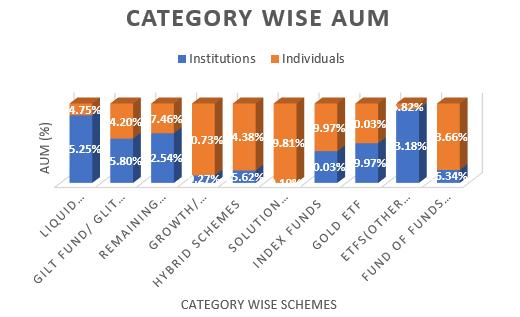 CustomersegmentwiseAAUMincategorywiseschemes: ThefollowingtableshowstheAAUMcontributionbytheindividualandinstitutionalinvestorsinthevariouscategoriesoftheschemesas: