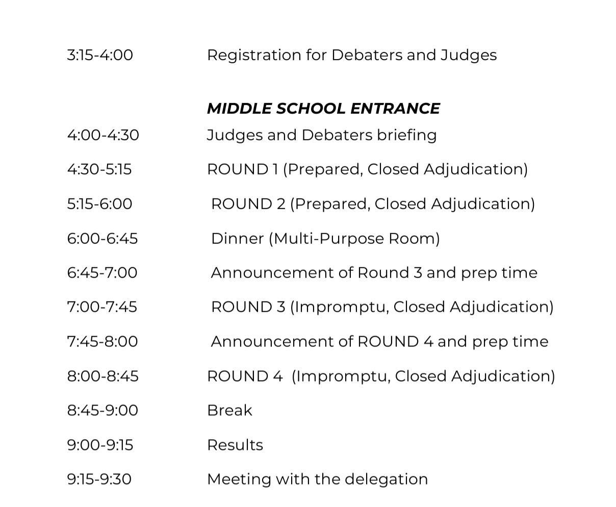 Please bring paper, pens, pencils, a water bottle, peanut free snack, and anything else you may wish to debate with.