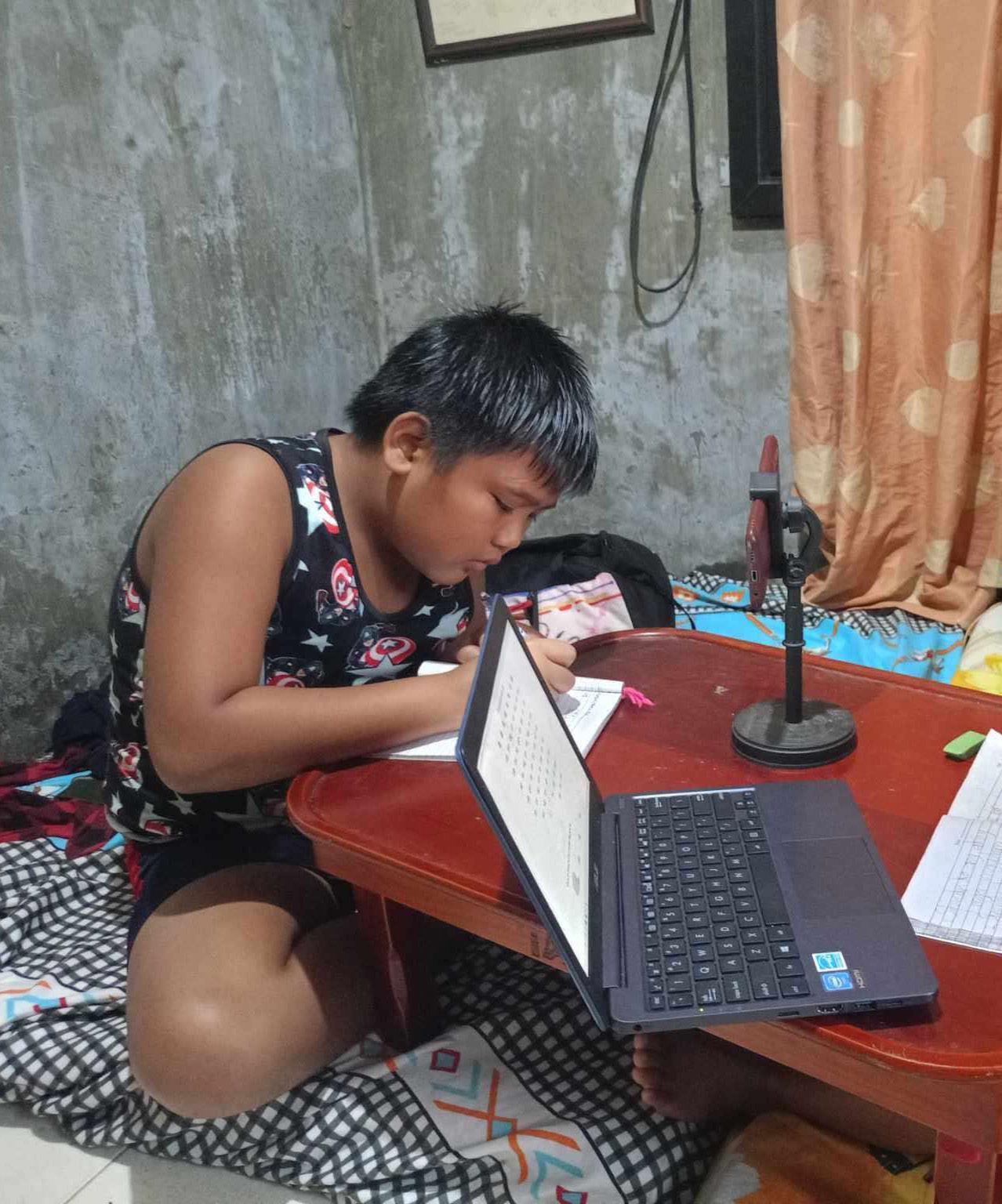 Alexander Rupert G. Directo, a grade 5 learner, answers his module as the school shifted to modular distance learning due to Typhoon Kristine . Photo by Kristine G. Directo